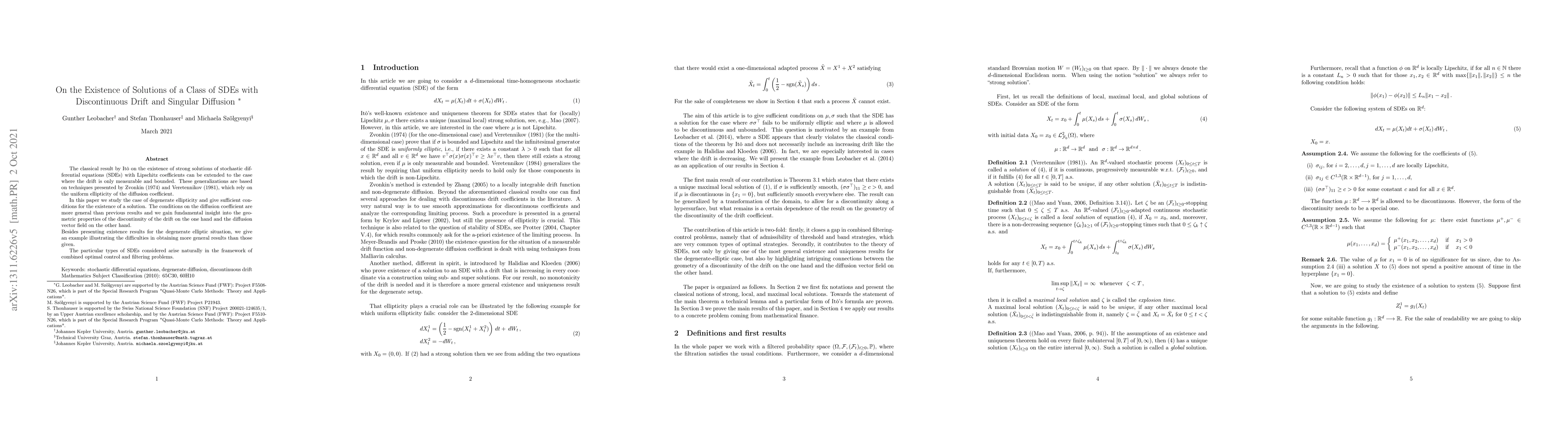 This paper extends classical results on the existence of strong solutions for stochastic differential equations (SDEs) to cases with measurable, bounded drift and singular diffusion, providing new sufficient conditions under degenerate ellipticity. It also highlights the geometric interplay between drift discontinuities and the diffusion vector field.