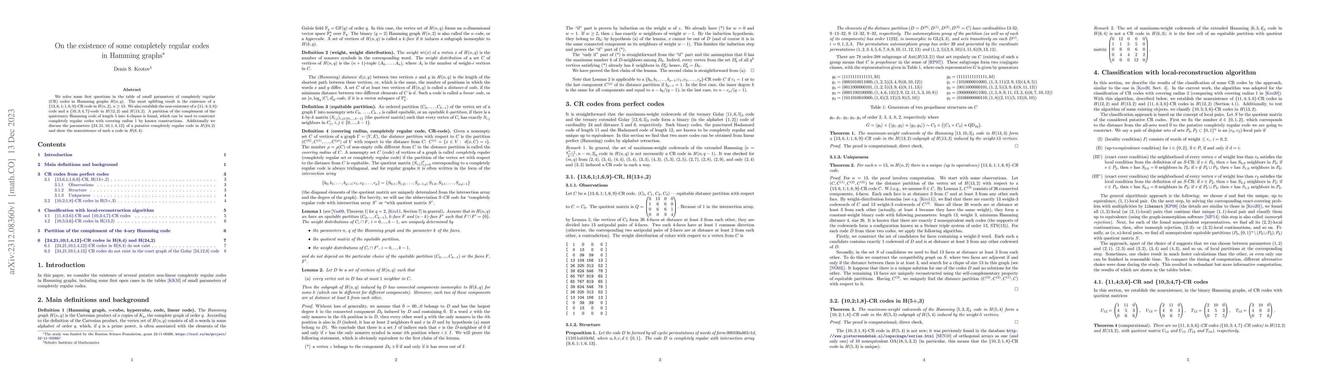 This paper investigates the existence of completely regular codes in Hamming graphs, confirming the existence of a $\{13,6,1;1,6,9\}$-CR code in $H(n,2)$ for $n\ge 13$ and proving the non-existence of $\{11,4;3,6\}$ and $\{10,3;4,7\}$ codes in $H(12,2)$ and $H(13,2)$. It also discusses the parameters of a potential code in $H(24,2)$ and disproves its existence in $H(8,4)$.
