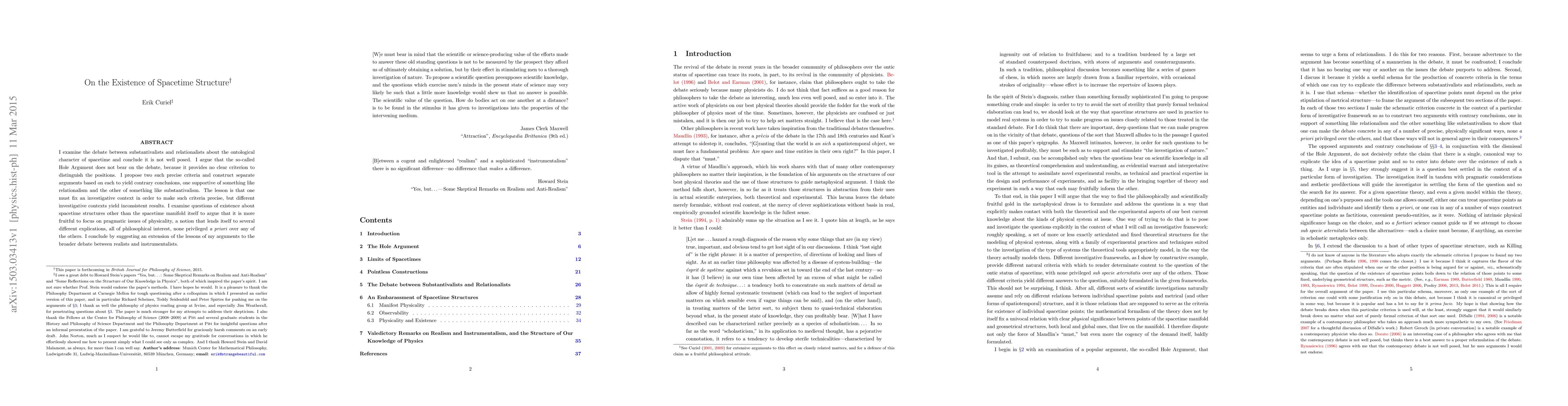 I examine the debate between substantivalists and relationalists about the ontological character of spacetime and conclude it is not well posed. I argue that the so-called Hole Argument does not bear on the debate, because it provides no clear criterion to distinguish the positions. I propose two such precise criteria and construct separate arguments based on each to yield contrary conclusions, one supportive of something like relationalism and the other of something like substantivalism. The lesson is that one must fix an investigative context in order to make such criteria precise, but different investigative contexts yield inconsistent results. I examine questions of existence about spacetime structures other than the spacetime manifold itself to argue that it is more fruitful to focus on pragmatic issues of physicality, a notion that lends itself to several different explications, all of philosophical interest, none privileged a priori over any of the others. I conclude by suggesting an extension of the lessons of my arguments to the broader debate between realists and instrumentalists.