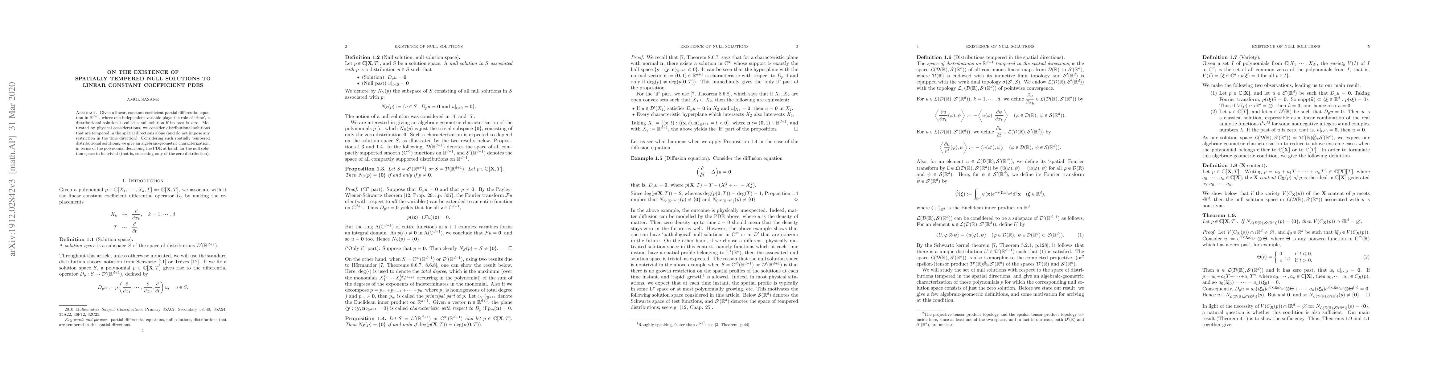 Given a linear, constant coefficient partial differential equation in ${\mathbb{R}}^{d+1}$, where one independent variable plays the role of `time', a distributional solution is called a null solution if its past is zero. Motivated by physical considerations, we consider distributional solutions that are tempered in the spatial directions alone (and do not impose any restriction in the time direction). Considering such spatially tempered distributional solutions, we give an algebraic-geometric characterization, in terms of the polynomial describing the PDE at hand, for the null solution space to be trivial (that is, consisting only of the zero distribution).