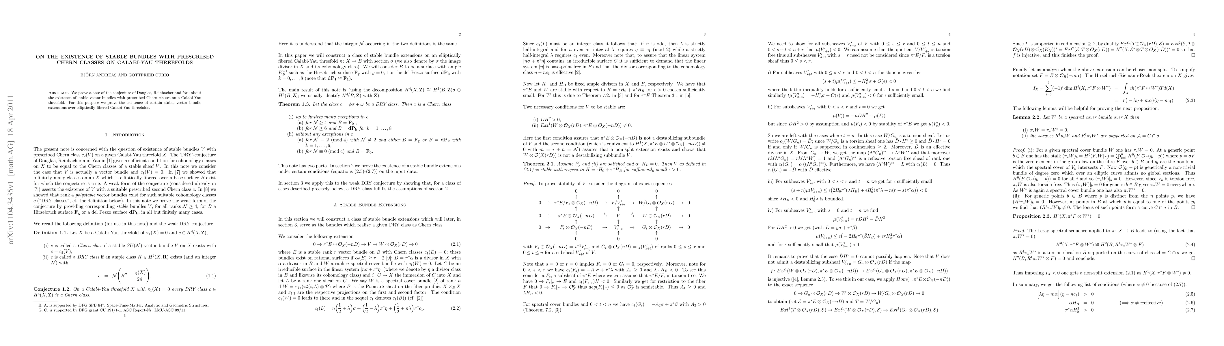 This research confirms a specific conjecture regarding stable vector bundles with prescribed Chern classes on Calabi-Yau threefolds, demonstrating the existence of such bundles through stable vector bundle extensions on elliptically fibered Calabi-Yau threefolds.