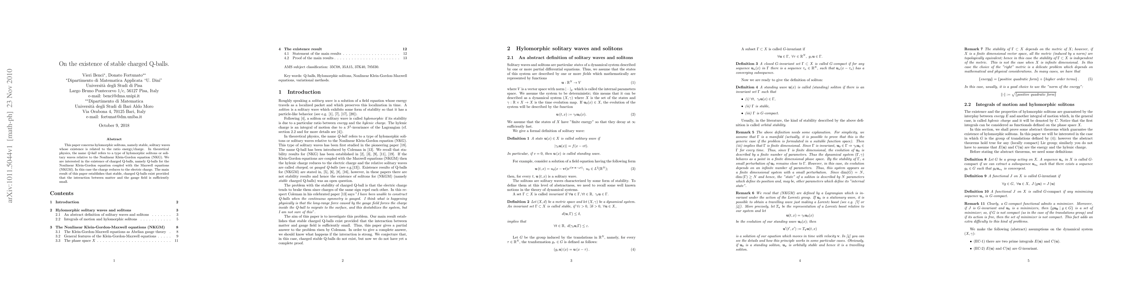 This paper concerns hylomorphic solitons, namely stable, solitary waves whose existence is related to the ratio energy/charge. In theoretical physics, the name Q-ball refers to a type of hylomorphic solitons or soli- tary waves relative to the Nonlinear Klein-Gordon equation (NKG). We are interested in the existence of charged Q-balls, namely Q-balls for the Nonlinear Klein-Gordon equation coupled with the Maxwell equations (NKGM). In this case the charge reduces to the electric charge. The main result of this paper establishes that stable, charged Q-balls exist provided that the interaction between matter and the gauge field is sufficiently small.