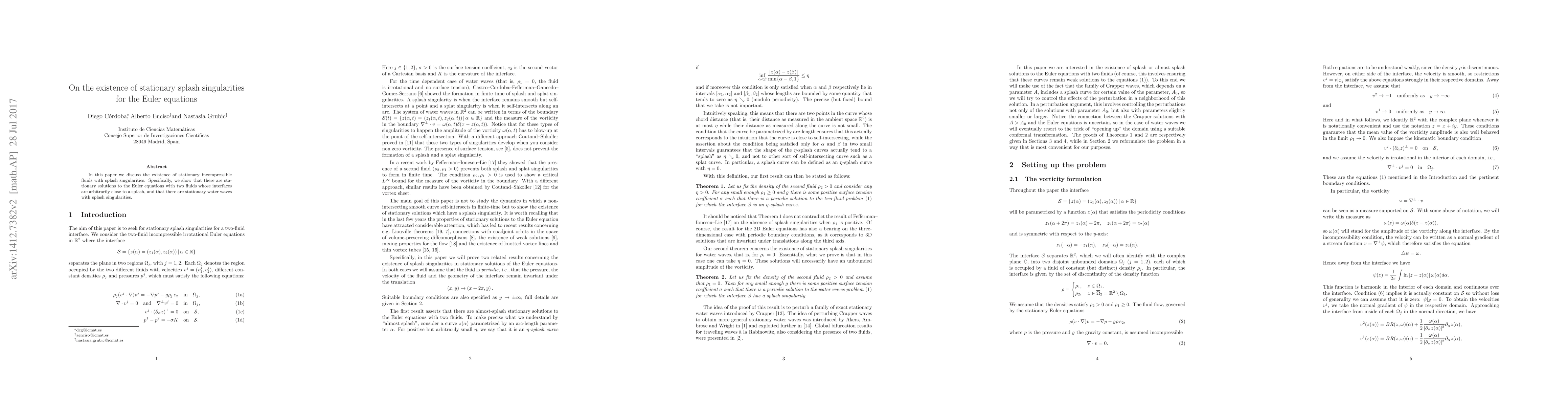 This paper demonstrates the existence of stationary solutions to the Euler equations featuring splash singularities in incompressible fluids, including interfaces of two fluids near a splash and stationary water waves with splash singularities.
