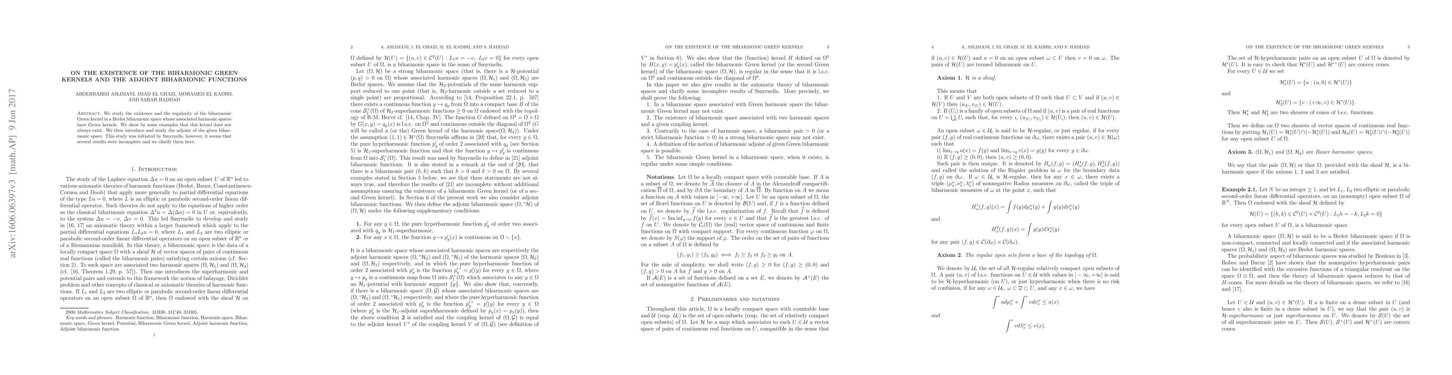 We study the existence and the regularity of the biharmonic Green kernel in a Brelot biharmonic space whose associated harmonic spaces have Green kernels. We show by some examples that this kernel does not always exist. We then introduce and study the adjoint of the given biharmonic space. This study was initiated by Smyrnelis, however, it seems that several results were incomplete and we clarify them here.