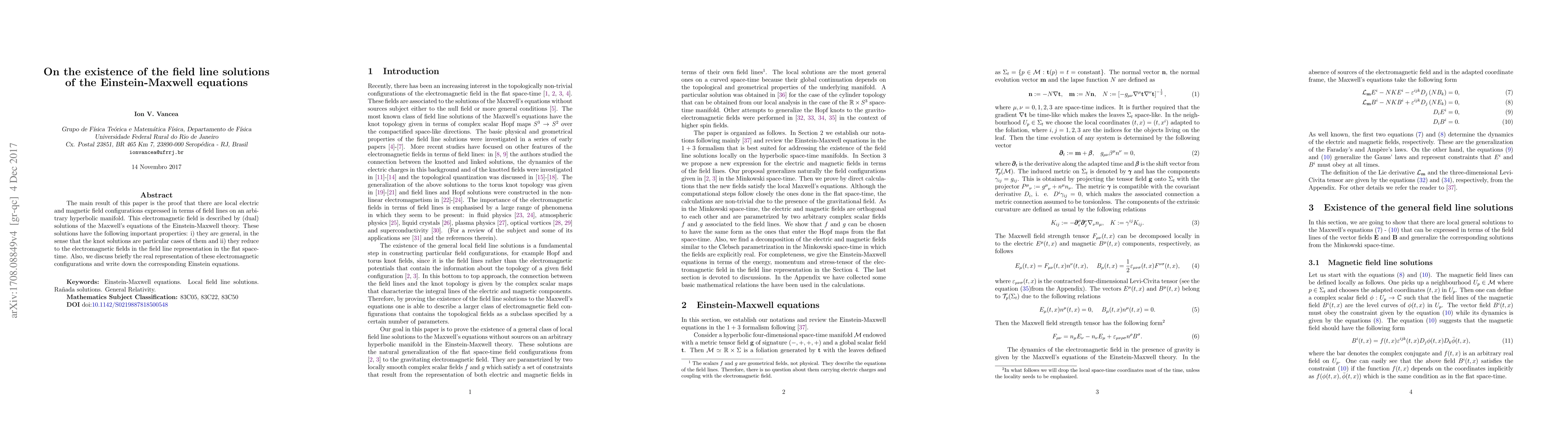 The main result of this paper is the proof that there are local electric and magnetic field configurations expressed in terms of field lines on an arbitrary hyperbolic manifold. This electromagnetic field is described by (dual) solutions of the Maxwell's equations of the Einstein-Maxwell theory. These solutions have the following important properties: i) they are general, in the sense that the knot solutions are particular cases of them and ii) they reduce to the electromagnetic fields in the field line representation in the flat space-time. Also, we discuss briefly the real representation of these electromagnetic configurations and write down the corresponding Einstein equations.