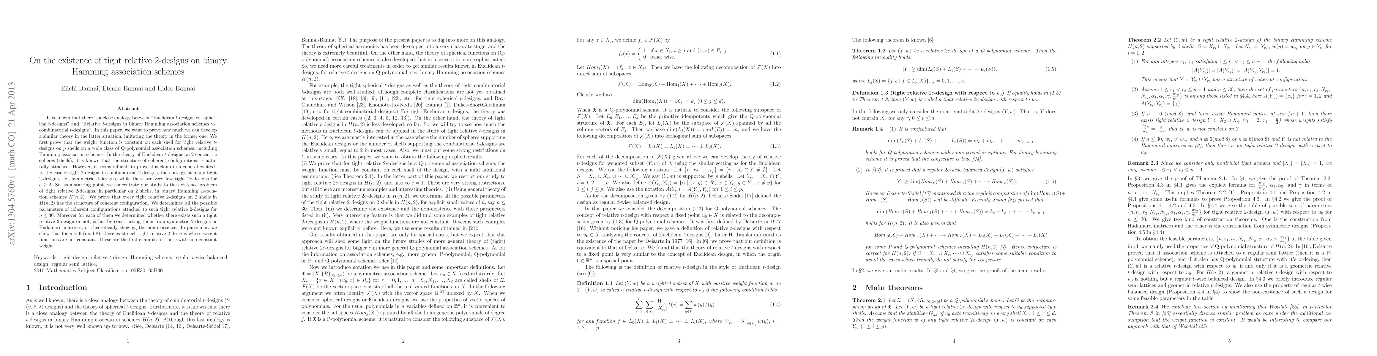 It is known that there is a close analogy between "Euclidean t-designs vs. spherical t-designs" and "Relative t-designs in binary Hamming association schemes vs. combinatorial t-designs". In this paper, we want to prove how much we can develop a similar theory in the latter situation, imitating the theory in the former one. We first prove that the weight function is constant on each shell for tight relative t-designs on p shells on a wide class of Q-polynomial association schemes, including Hamming association schemes. In the theory of Euclidean t-designs on 2 concentric spheres (shells), it is known that the structure of coherent configurations is naturally attached. However, it seems difficult to prove this claim in a general context. In the case of tight 2-designs in combinatorial 2-designs, there are great many tight 2-designs, i.e., symmetric 2-designs, while there are very few tight 2e-designs for e no less than 2. So, as a starting point, we concentrate our study to the existence problem of tight relative 2-designs, in particular on 2 shells, in binary Hamming association schemes H(n,2). We prove that every tight relative 2-designs on 2 shells in H(n,2) has the structure of coherent configuration. We determined all the possible parameters of coherent configurations attached to such tight relative 2-designs for n at most 30. Moreover for each of them we determined whether there exists such a tight relative 2-design or not, either by constructing them from symmetric 2-designs or Hadamard matrices, or theoretically showing the non-existence. In particular, we show that for n congruent to 6 (mod 8), there exist such tight relative 2-designs whose weight functions are not constant. These are the first examples of those with non-constant weight.