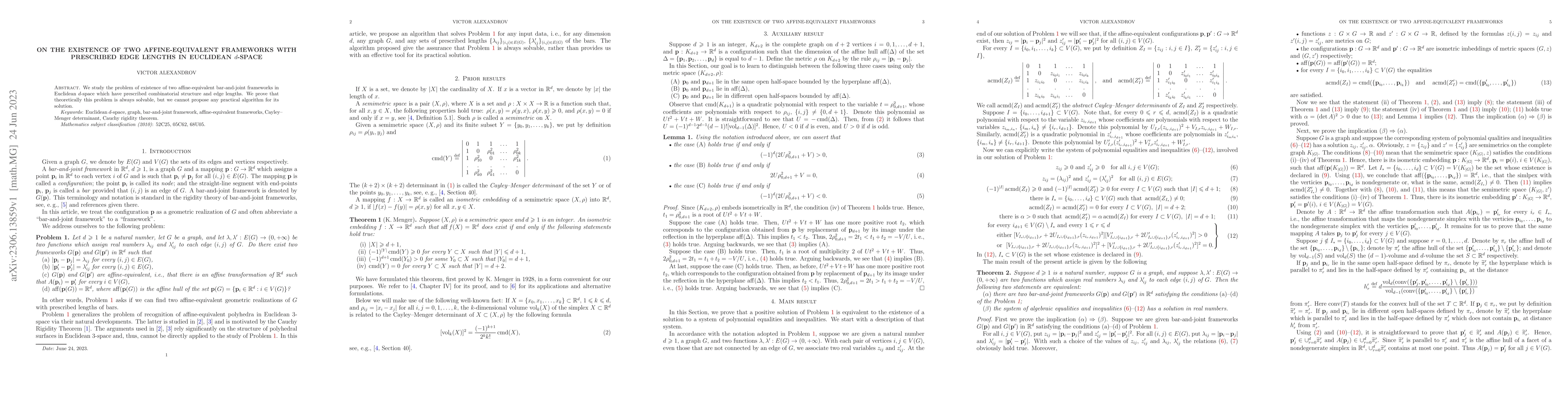 Summary: This paper proves the existence of two affine-equivalent frameworks in Euclidean $d$-space with prescribed combinatorial structure and edge lengths, though it does not provide a practical algorithm to achieve this.