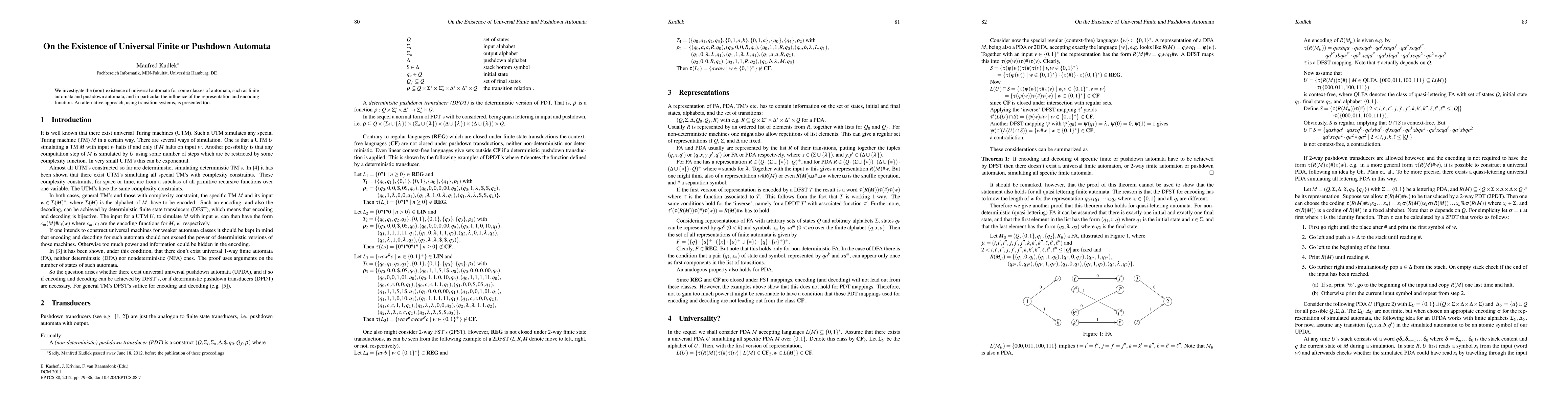 This research explores whether universal finite or pushdown automata exist, considering the impact of representation and encoding. It also introduces an alternative method using transition systems to study this problem.