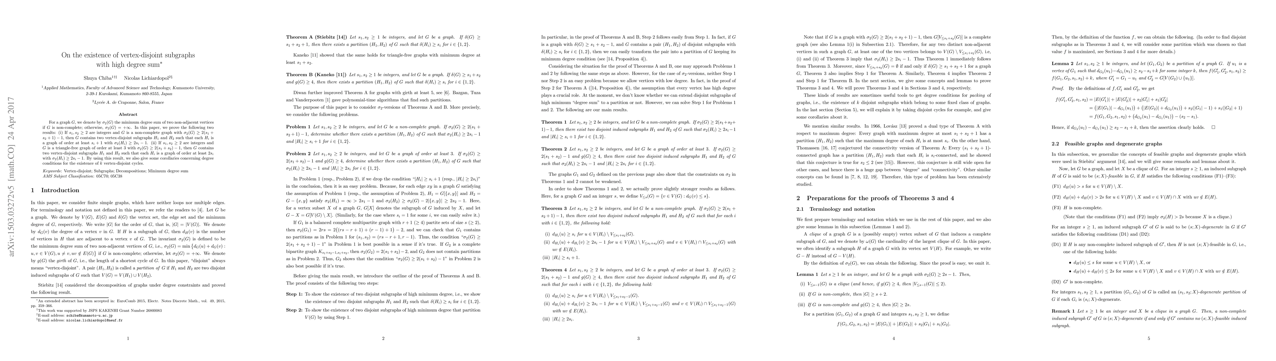For a graph $G$, we denote by $\sigma_{2}(G)$ the minimum degree sum of two non-adjacent vertices if $G$ is non-complete; otherwise, $\sigma_{2}(G) = +\infty$. In this paper, we prove the following two results: (i) If $s_{1}, s_{2} \ge 2$ are integers and $G$ is a non-complete graph with $\sigma_{2}(G) \ge 2(s_{1} + s_{2} + 1) - 1$, then $G$ contains two vertex-disjoint subgraphs $H_{1}$ and $H_{2}$ such that each $H_{i}$ is a graph of order at least $s_{i}+1$ with $\sigma_{2}(H_{i}) \ge 2s_{i} - 1$. (ii) If $s_{1}, s_{2} \ge 2$ are integers and $G$ is a triangle-free graph of order at least $3$ with $\sigma_{2}(G) \ge 2(s_{1} + s_{2}) - 1$, then $G$ contains two vertex-disjoint subgraphs $H_{1}$ and $H_{2}$ such that each $H_{i}$ is a graph of order at least $2s_{i}$ with $\sigma_{2}(H_{i}) \ge 2s_{i} - 1$. By using this result, we also give some corollaries concerning degree conditions for the existence of $k$ vertex-disjoint cycles.