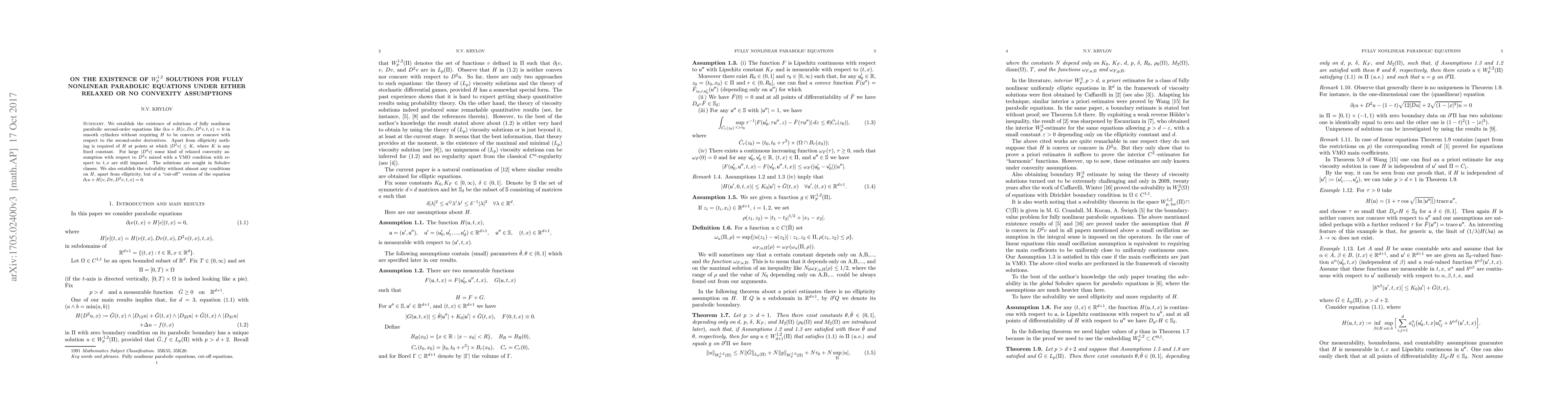 We establish the existence of solutions of fully nonlinear parabolic second-order equations like $\partial_{t}u+H(v,Dv,D^{2}v,t,x)=0$ in smooth cylinders without requiring $H$ to be convex or concave with respect to the second-order derivatives. Apart from ellipticity nothing is required of $H$ at points at which $|D^{2}v|\leq K$, where $K$ is any fixed constant. For large $|D^{2}v|$ some kind of relaxed convexity assumption with respect to $D^{2}v$ mixed with a VMO condition with respect to $t,x$ are still imposed. The solutions are sought in Sobolev classes. We also establish the solvability without almost any conditions on $H$, apart from ellipticity, but of a "cut-off" version of the equation $\partial_{t}u+H(v,Dv,D^{2}v,t,x)=0$.