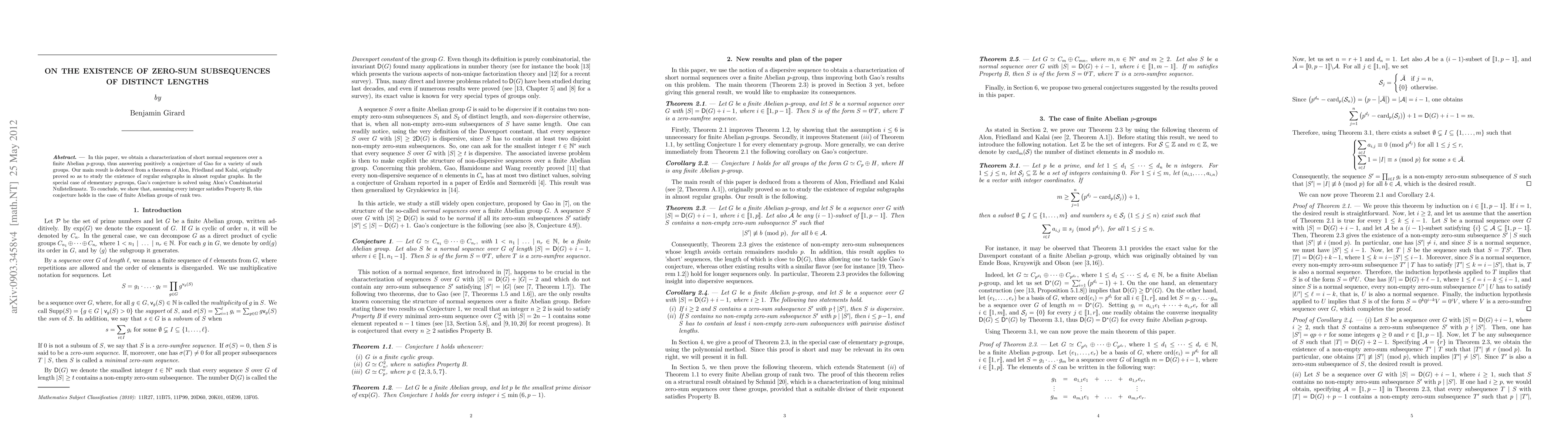 In this paper, we obtain a characterization of short normal sequences over a finite Abelian p-group, thus answering positively a conjecture of Gao for a variety of such groups. Our main result is deduced from a theorem of Alon, Friedland and Kalai, originally proved so as to study the existence of regular subgraphs in almost regular graphs. In the special case of elementary p-groups, Gao's conjecture is solved using Alon's Combinatorial Nullstellensatz. To conclude, we show that, assuming every integer satisfies Property B, this conjecture holds in the case of finite Abelian groups of rank two.