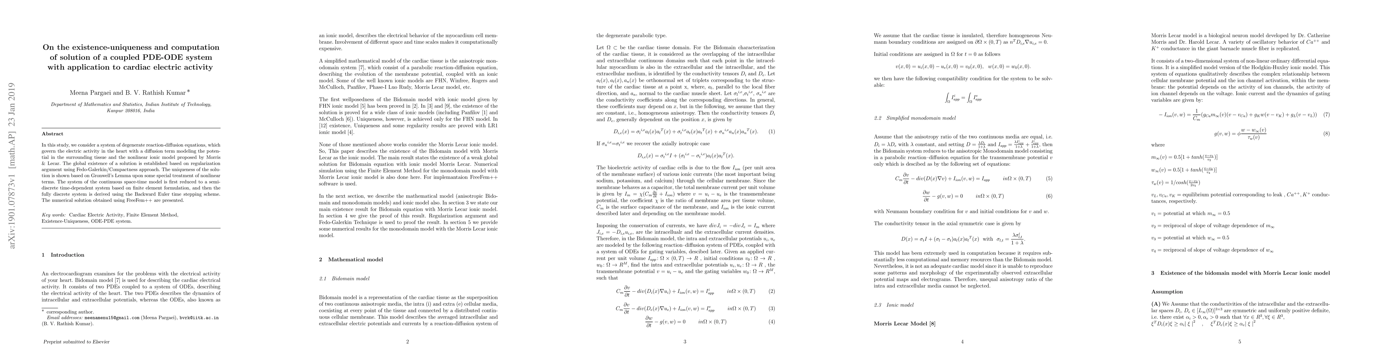 In this study, we consider a system of degenerate reaction-diffusion equations, which govern the electric activity in the heart with a diffusion term modeling the potential in the surrounding tissue and the nonlinear ionic model proposed by Morris $\&$ Lecar. The global existence of a solution is established based on regularization argument using Fedo-Galerkin/Compactness approach. The uniqueness of the solution is shown based on Gronwell's Lemma upon some special treatment of nonlinear terms. The system of the continuous space-time model is first reduced to a semi-discrete time-dependent system based on finite element formulation, and then the fully discrete system is derived using the Backward Euler time stepping scheme. The numerical solution obtained using FreeFem++ are presented.
