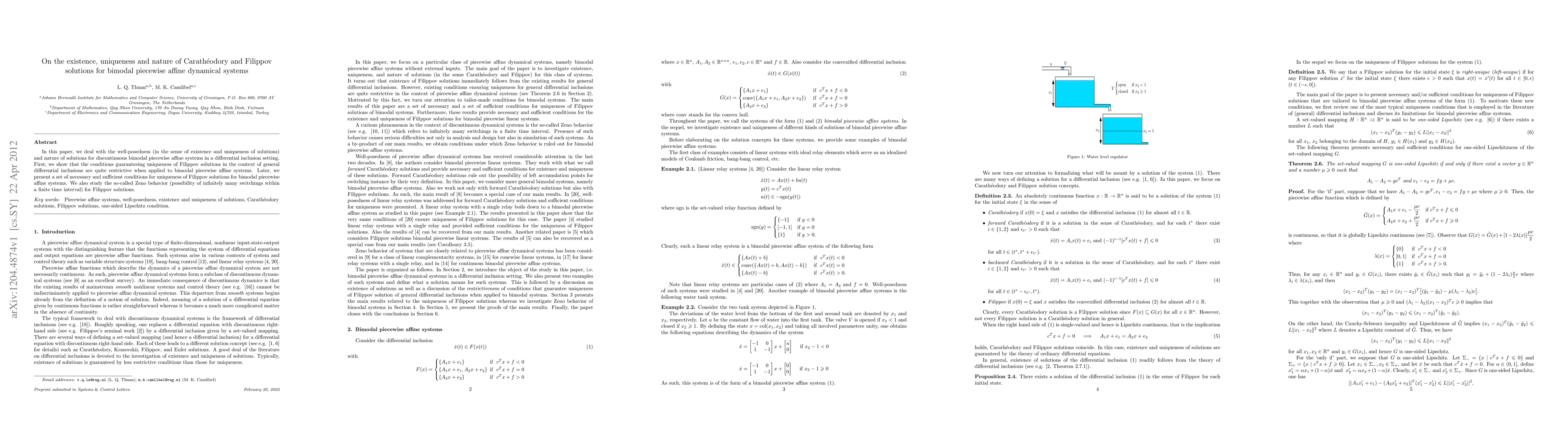 This paper investigates the existence, uniqueness, and nature of solutions for discontinuous bimodal piecewise affine dynamical systems, focusing on the differential inclusion setting. It finds that while conditions for Filippov solution uniqueness in general differential inclusions are restrictive, specific conditions guarantee uniqueness for bimodal systems and examines Zeno behavior.