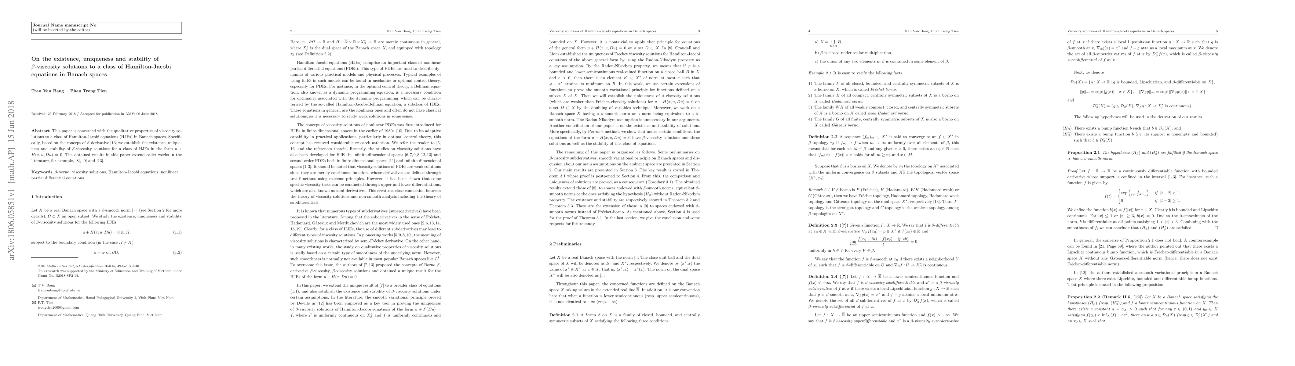 This paper is concerned with the qualitative properties of viscocity solutions to a class of Hamilton-Jacobi equations (HJEs) in Banach spaces. Specifically, based on the concept of $\beta$-derivative \cite{DGZ93b} we establish the existence, uniqueness and stability of $\beta$-viscosity solutions for a class of HJEs in the form $u+H(x,u,Du)=0.$ The obtained results in this paper extend ealier works in the literature, for example, \cite{CL85}, \cite{CL86} and \cite{DGZ93b}.