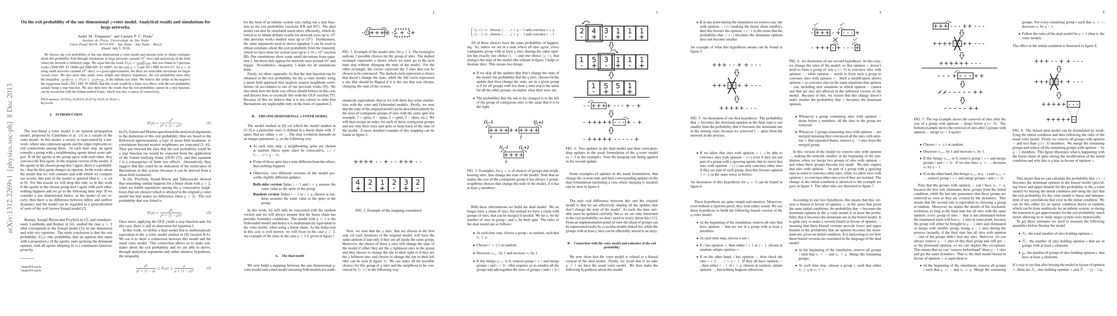 This paper investigates the exit probability in the one-dimensional $q$-voter model, providing both analytical results and large-scale simulations. It confirms that the previously derived formula $E(\rho) = \frac{\rho^q}{\rho^q + (1-\rho)^q}$ holds but shows deviations for larger networks, while also proving that the exit probability cannot be a step function.