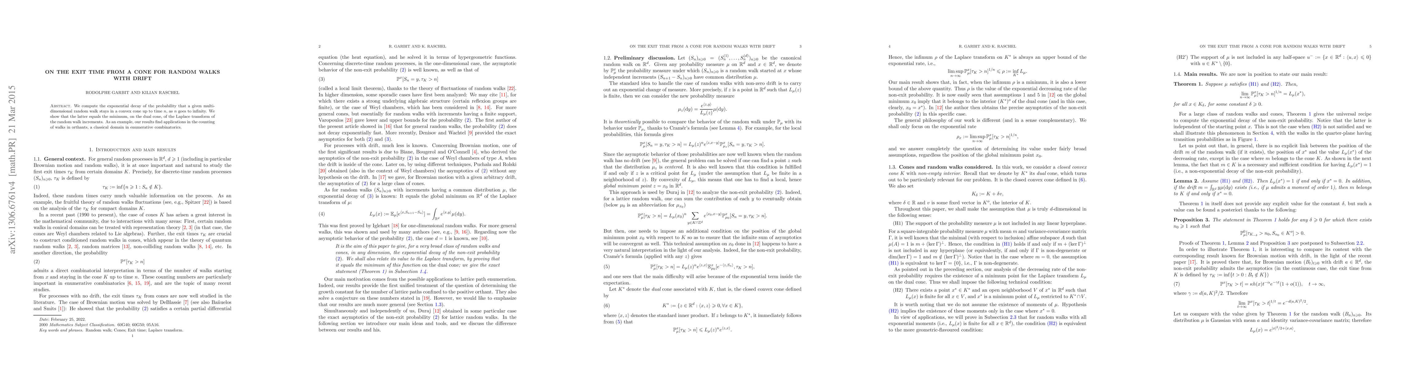 We compute the exponential decay of the probability that a given multi-dimensional random walk stays in a convex cone up to time $n$, as $n$ goes to infinity. We show that the latter equals the minimum, on the dual cone, of the Laplace transform of the random walk increments. As an example, our results find applications in the counting of walks in orthants, a classical domain in enumerative combinatorics.
