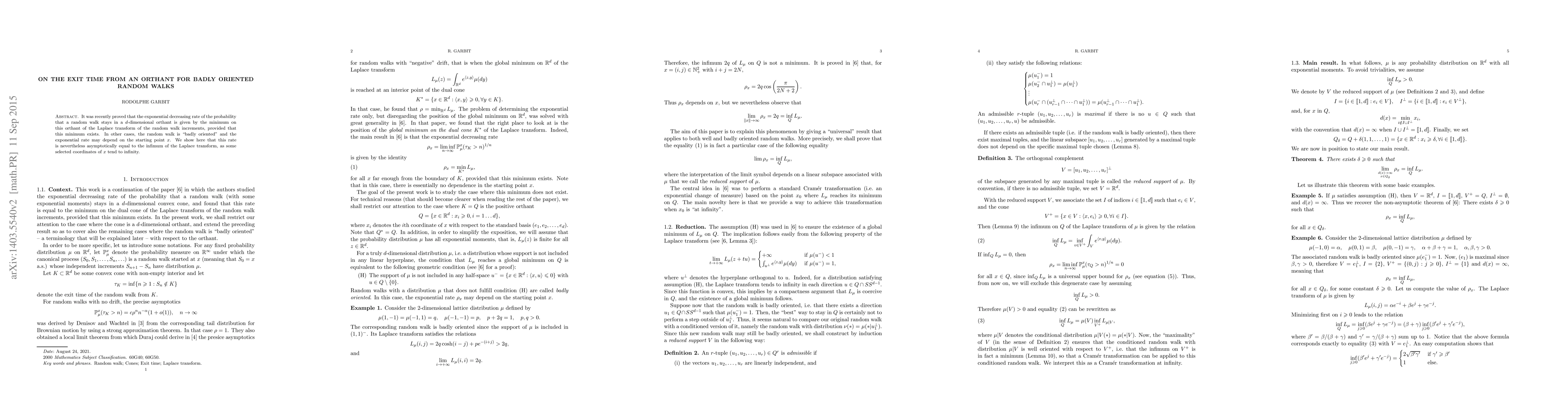 In a recent paper, K. Raschel and R. Garbit proved that the exponential decreasing rate of the probability that a random walk (with all exponential moments) stays in a $d$-dimensional orthant is given by the minimum on this orthant of the Laplace transform of the random walk increments, as soon as this minimum exists. In other cases, the random walk is "badly oriented," and the exponential rate may depend on the starting point $x$. We prove here that this rate is nevertheless asymptotically equal to the infimum of the Laplace transform, as some selected coordinates of $x$ tend to infinity.