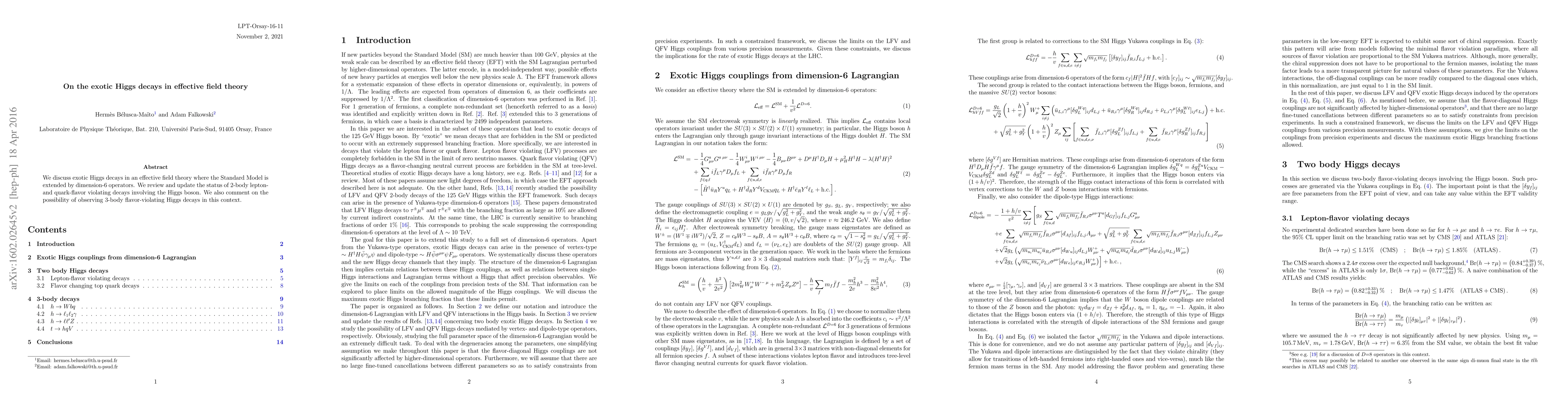 This paper explores exotic Higgs decays in an effective field theory framework, focusing on dimension-6 operators that extend the Standard Model. It reviews and updates the status of 2-body lepton- and quark-flavor violating decays involving the Higgs boson, and discusses the potential for observing 3-body flavor-violating Higgs decays.