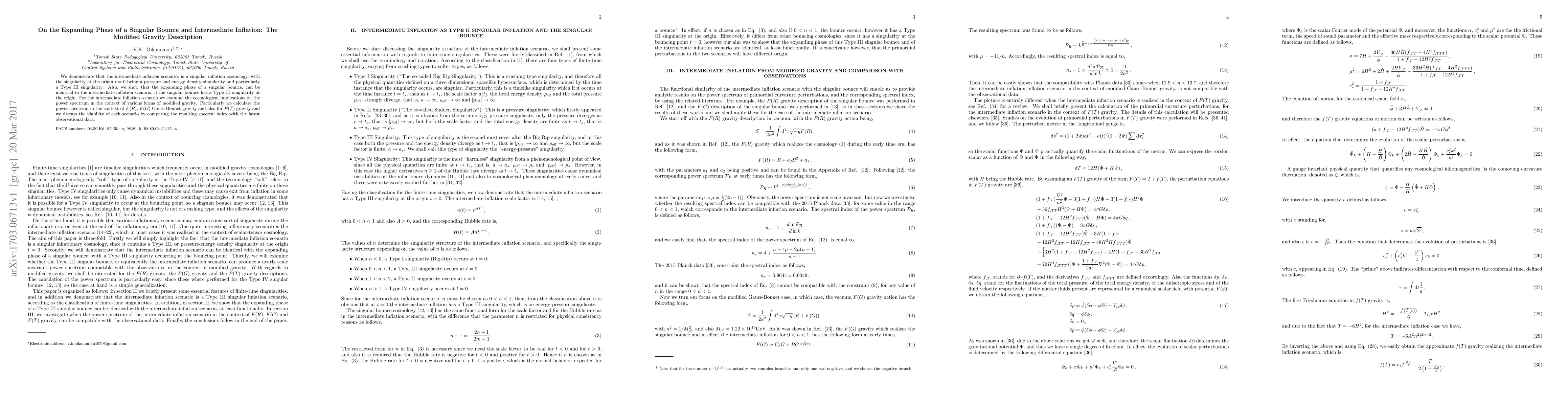 This paper explores the intermediate inflation cosmology as a singular bounce scenario with a Type III singularity at the origin, and examines its cosmological implications under various modified gravity theories, including $F(R)$, $F(G)$, and $F(T)$ gravity, comparing the resulting spectral index to observational data to assess viability.