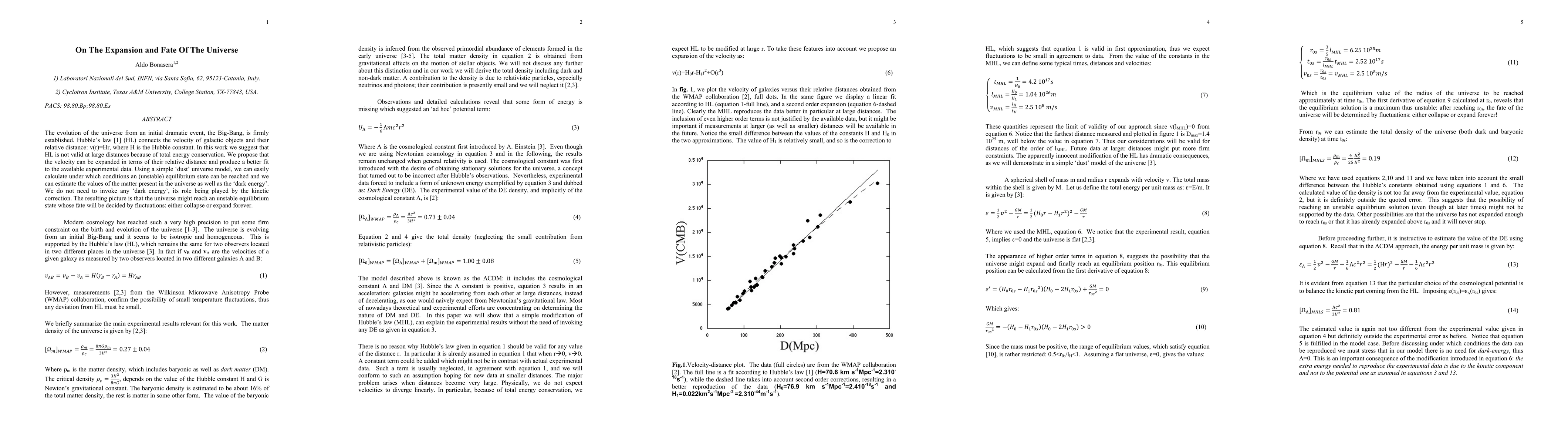 The evolution of the universe from an initial dramatic event, the Big-Bang, is firmly established. Hubble's law [1] (HL) connects the velocity of galactic objects and their relative distance: v(r)=Hr, where H is the Hubble constant. In this work we suggest that HL is not valid at large distances because of total energy conservation. We propose that the velocity can be expanded in terms of their relative distance and produce a better fit to the available experimental data. Using a simple 'dust' universe model, we can easily calculate under which conditions an (unstable) equilibrium state can be reached and we can estimate the values of the matter present in the universe as well as the 'dark energy'. We do not need to invoke any 'dark energy', its role being played by the kinetic correction. The resulting picture is that the universe might reach an unstable equilibrium state whose fate will be decided by fluctuations: either collapse or expand forever.