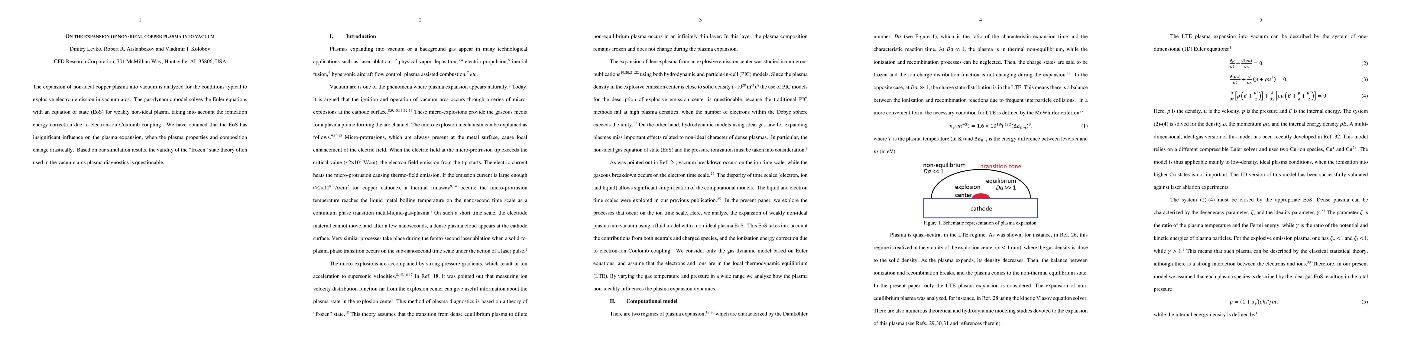 The study analyzes the expansion of non-ideal copper plasma into vacuum under vacuum arc conditions, finding minimal impact from the equation of state despite significant plasma property changes. The results challenge the 'frozen' state theory commonly used in vacuum arc diagnostics.