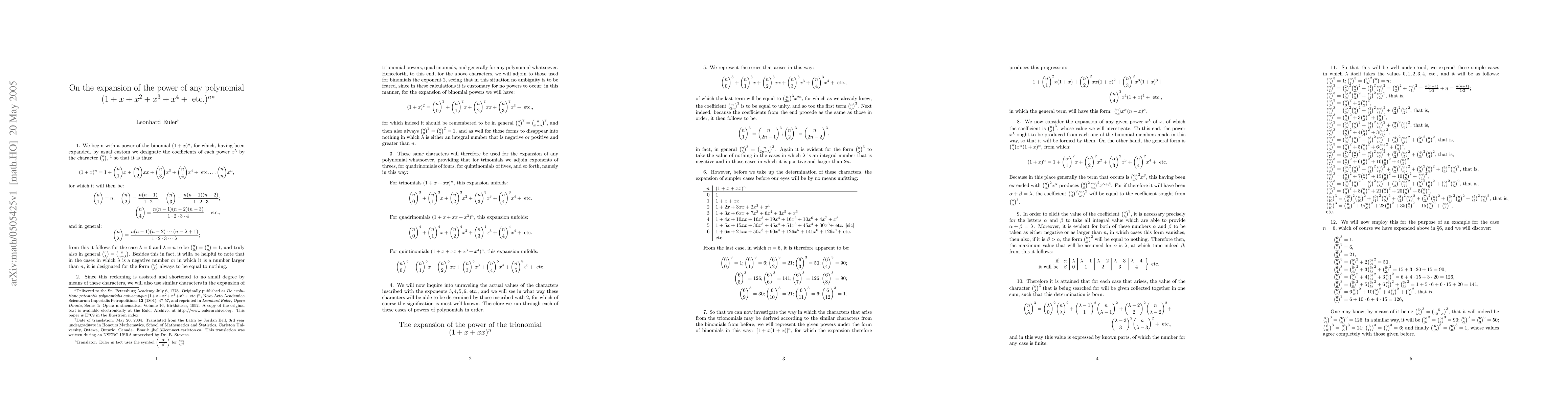 In this paper, Euler gives the general trionomial coefficient as a sum of the binomial coefficients, the general quadrinomial coefficient as a sum of the binomial and trinomial coefficients, the general quintonomial coefficient as a sum of the binomial and quadrinomial coefficients, and gives a general determination of the coefficients of the expansion of any polynomial (1+x+x^2+...+x^m)^n as a sum of the coefficients of lower degree polynomial coefficients.