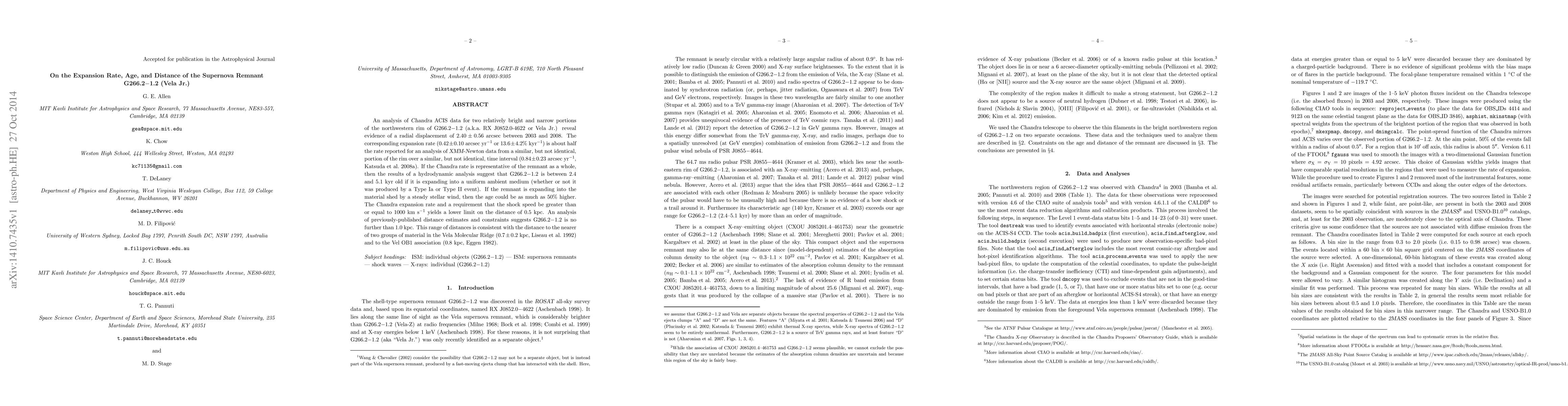 This paper analyzes Chandra data to determine the expansion rate of the supernova remnant G266.2-1.2, finding it to be about half that previously reported, suggesting an age of 2.4 to 5.1 kyr and a distance of 0.5 to 1.0 kpc.
