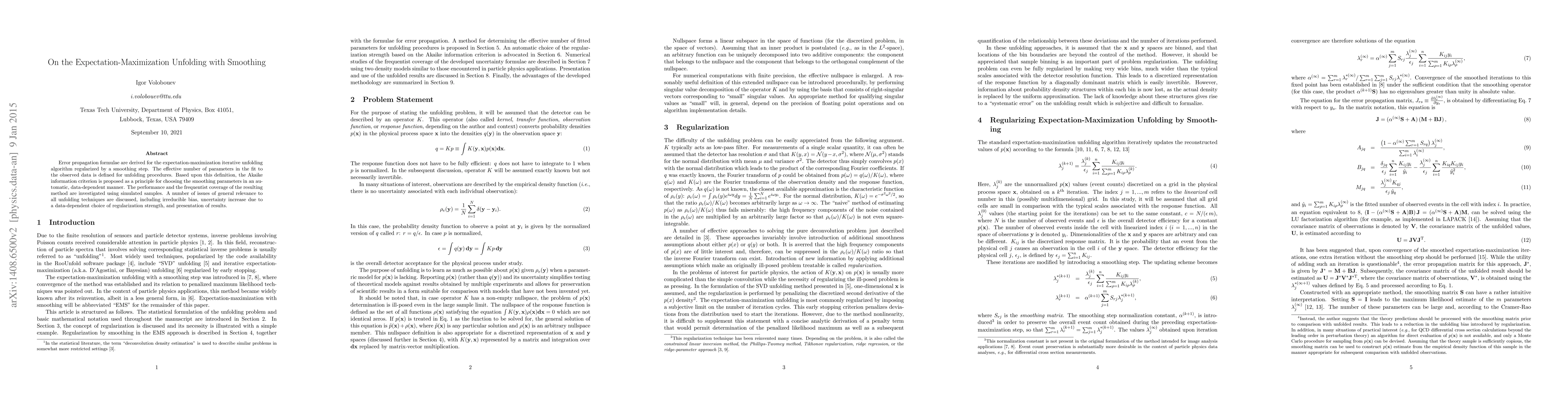 This paper develops error propagation for the expectation-maximization unfolding algorithm with a smoothing step, proposing the Akaike information criterion for automatic selection of smoothing parameters. It investigates the method's performance and frequentist coverage using simulated data, addressing issues like irreducible bias and data-dependent regularization.