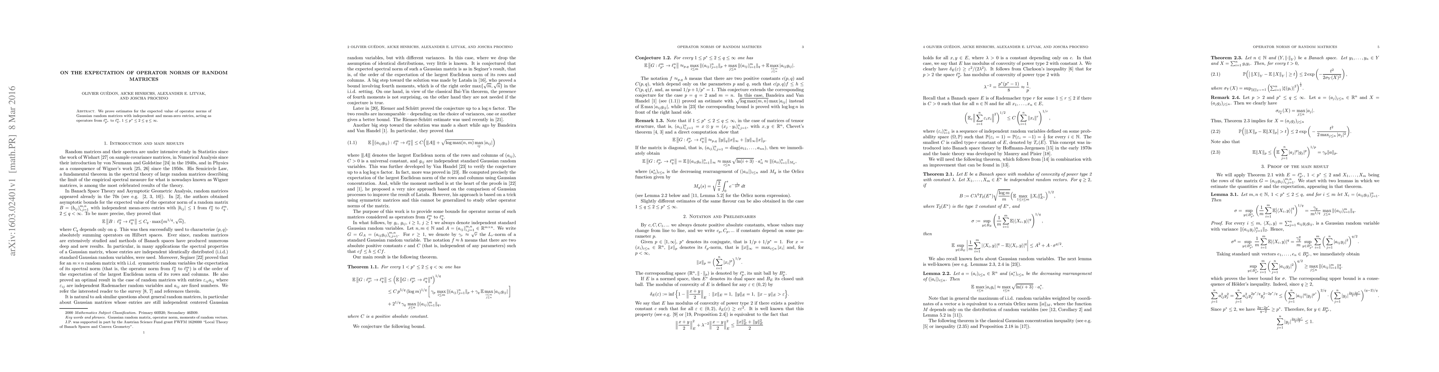 This paper provides estimates for the expected value of operator norms of Gaussian random matrices with mean-zero entries, focusing on the mapping from $\ell^m_{p^*}$ to $\ell_q^n$ spaces under various $p^*$ and $q$ conditions. The results offer insights into the probabilistic behavior of these matrices.