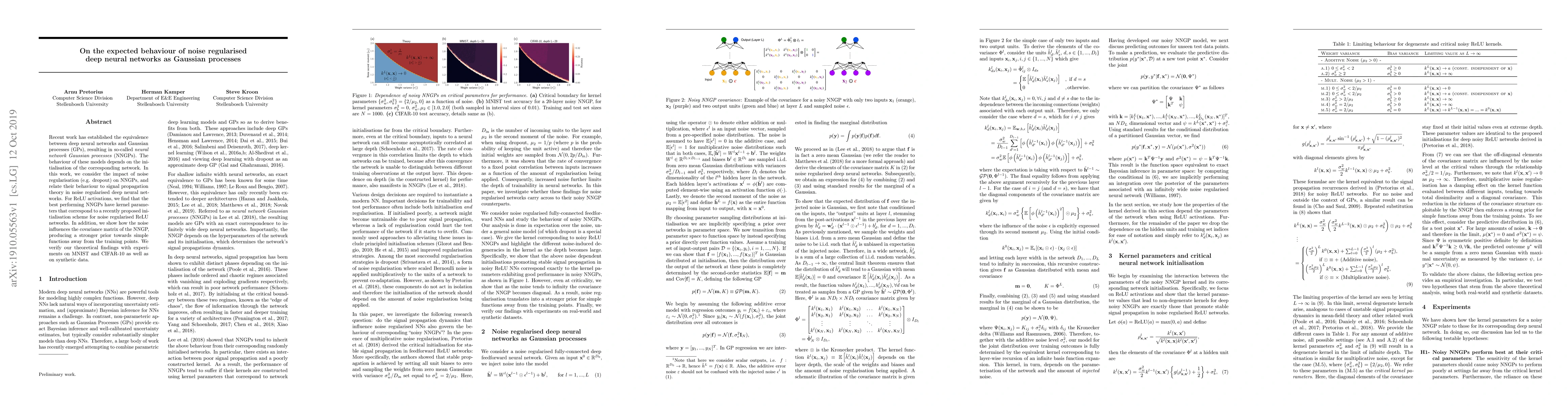 This paper explores how noise regularisation in deep neural networks affects their behaviour as neural network Gaussian processes (NNGPs), showing that optimal performance aligns with a specific initialisation scheme. The study also demonstrates how noise influences the NNGP's covariance matrix, leading to a stronger prior for simpler functions, and validates these findings experimentally on MNIST, CIFAR-10, and synthetic data.