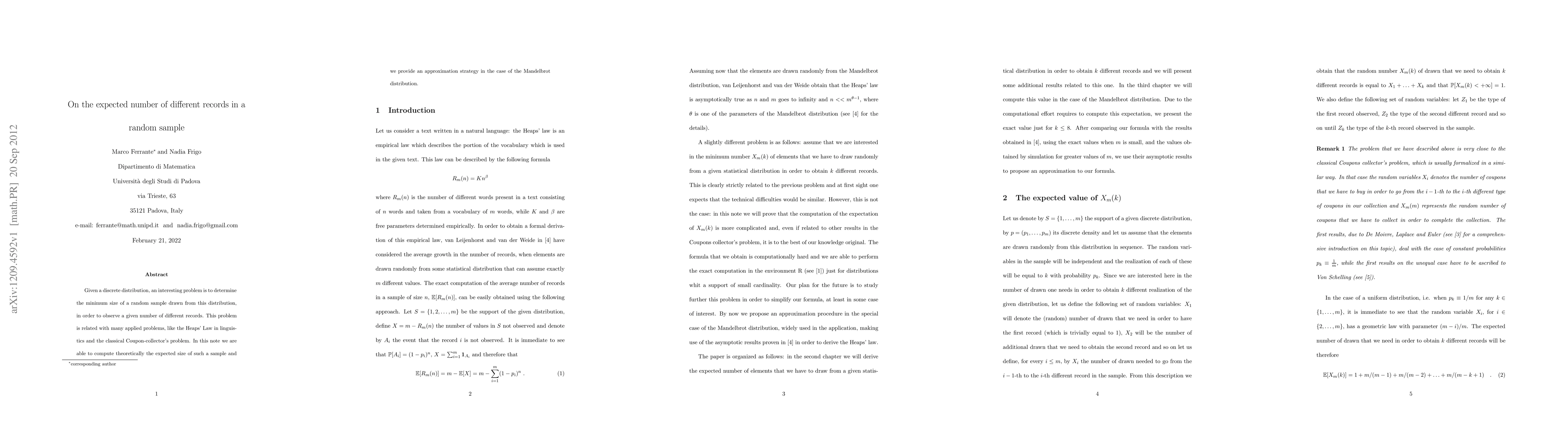 Given a discrete distribution, an interesting problem is to determine the minimum size of a random sample drawn from this distribution, in order to observe a given number of different records. This problem is related with many applied problems, like the Heaps' Law in linguistics and the classical Coupon-collector's problem. In this note we are able to compute theoretically the expected size of such a sample and we provide an approximation strategy in the case of the Mandelbrot distribution.