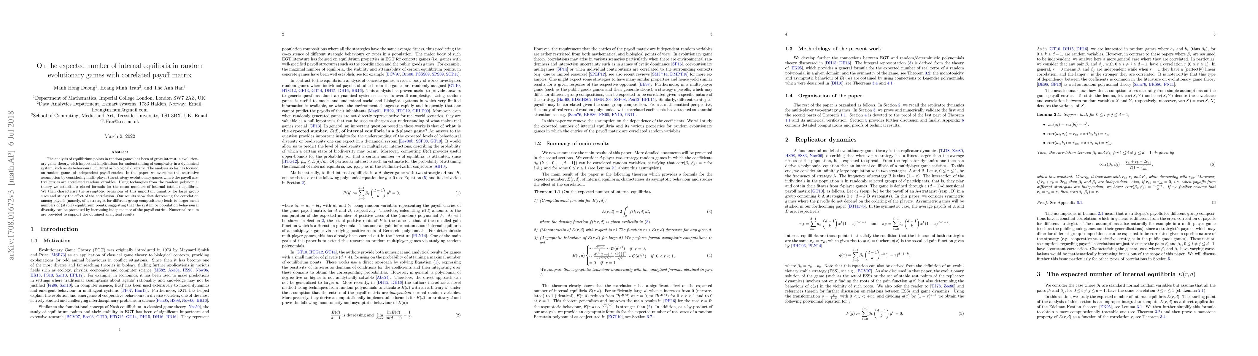 This paper develops a formula for the expected number of internal equilibria in random evolutionary games with correlated payoff matrices, revealing that lower correlation among payoffs enhances the diversity of stable equilibria. Analytical results are supplemented with numerical validation.
