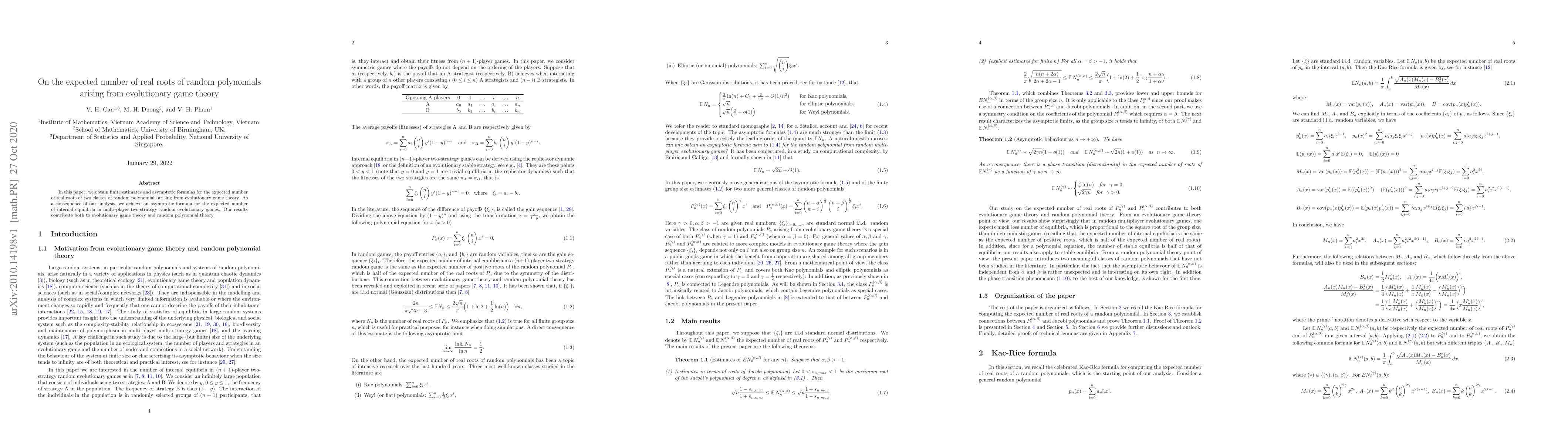 This paper provides finite estimates and asymptotic formulas for the expected number of real roots of random polynomials derived from evolutionary game theory, leading to insights into the expected number of internal equilibria in multi-player games. The findings enhance both evolutionary game theory and random polynomial analysis.