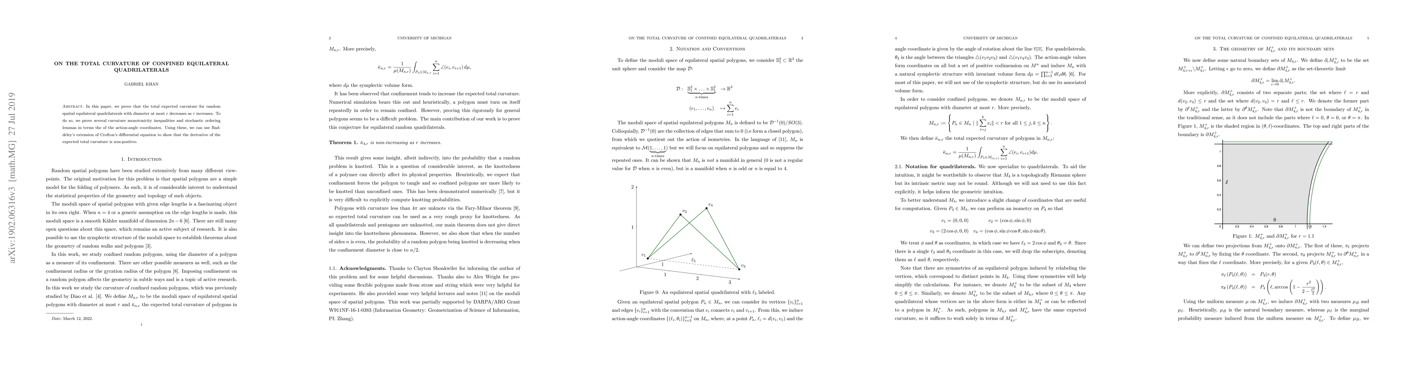 In this paper, we prove that the total expected curvature for random spatial equilateral quadrilaterals with diameter at most $r$ decreases as $r$ increases. To do so, we prove several curvature monotonicity inequalities and stochastic ordering lemmas in terms the of the action-angle coordinates. Using these, we can use Baddeley's extension of Crofton's differential equation to show that the derivative of the expected total curvature is non-positive.