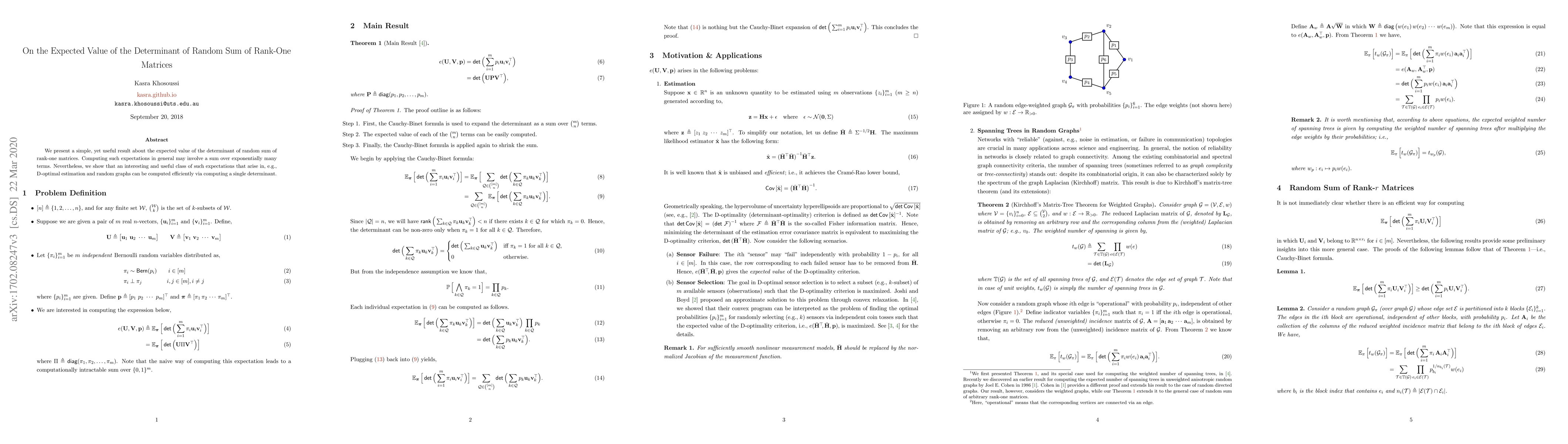 This paper presents an efficient method to compute the expected value of the determinant of a random sum of rank-one matrices, which typically involves a computationally intensive sum over many terms. The authors demonstrate that certain classes of these expectations, relevant in D-optimal estimation and random graphs, can be computed by evaluating a single determinant.