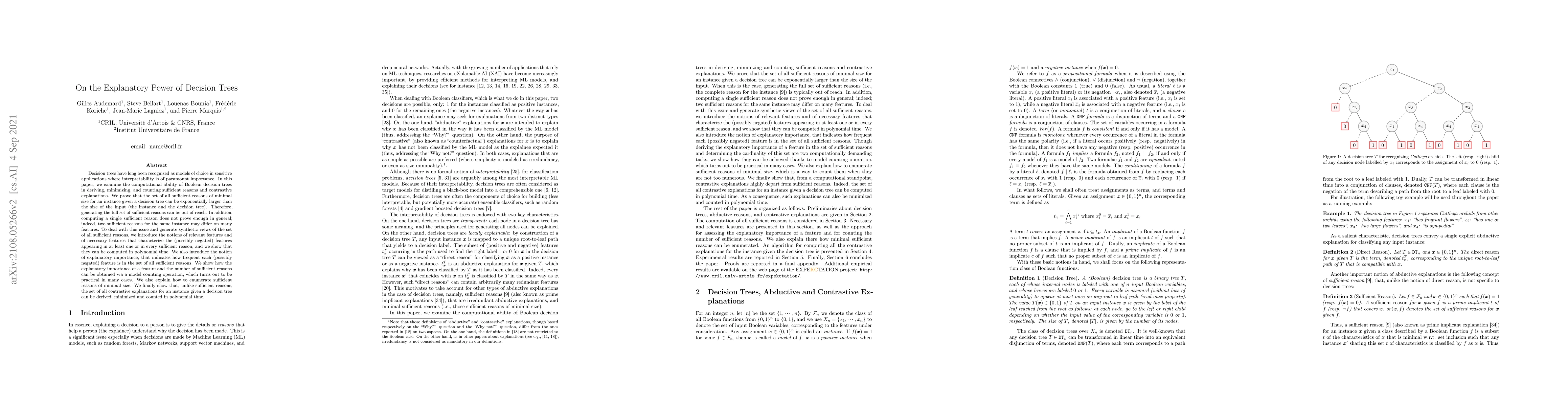 Decision trees have long been recognized as models of choice in sensitive applications where interpretability is of paramount importance. In this paper, we examine the computational ability of Boolean decision trees in deriving, minimizing, and counting sufficient reasons and contrastive explanations. We prove that the set of all sufficient reasons of minimal size for an instance given a decision tree can be exponentially larger than the size of the input (the instance and the decision tree). Therefore, generating the full set of sufficient reasons can be out of reach. In addition, computing a single sufficient reason does not prove enough in general; indeed, two sufficient reasons for the same instance may differ on many features. To deal with this issue and generate synthetic views of the set of all sufficient reasons, we introduce the notions of relevant features and of necessary features that characterize the (possibly negated) features appearing in at least one or in every sufficient reason, and we show that they can be computed in polynomial time. We also introduce the notion of explanatory importance, that indicates how frequent each (possibly negated) feature is in the set of all sufficient reasons. We show how the explanatory importance of a feature and the number of sufficient reasons can be obtained via a model counting operation, which turns out to be practical in many cases. We also explain how to enumerate sufficient reasons of minimal size. We finally show that, unlike sufficient reasons, the set of all contrastive explanations for an instance given a decision tree can be derived, minimized and counted in polynomial time.