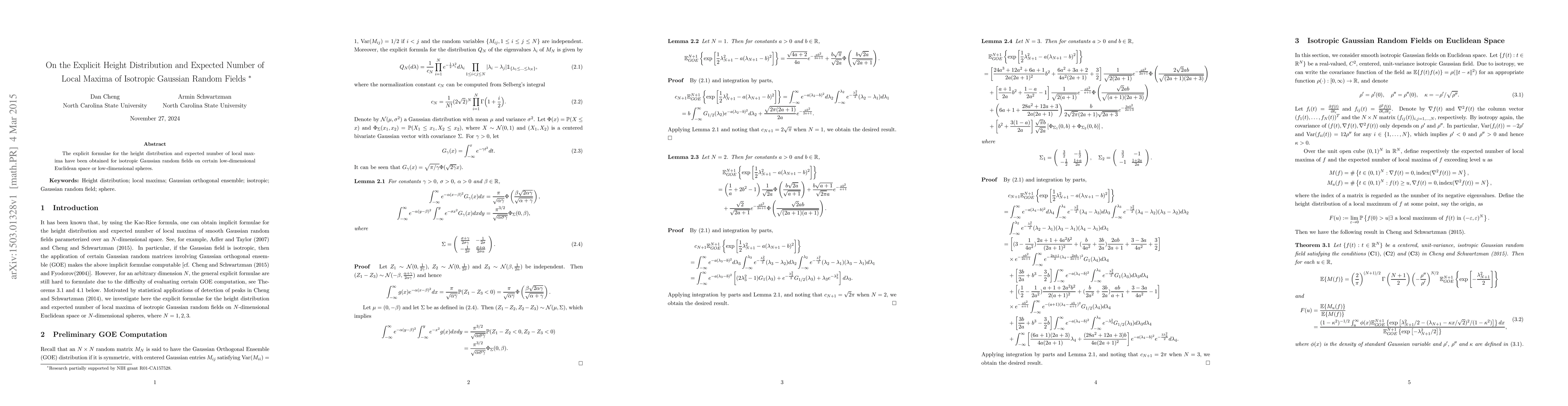 Summary: The paper provides explicit formulae for the height distribution and expected number of local maxima of isotropic Gaussian random fields in low-dimensional Euclidean spaces and spheres. These results enhance the understanding of the statistical properties of such random fields.