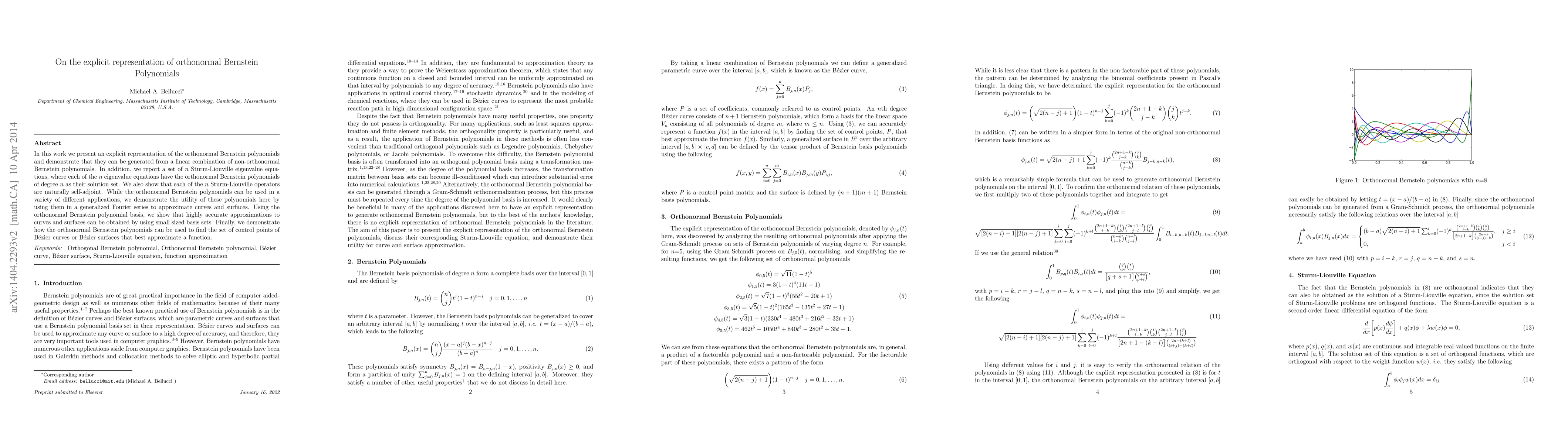 This paper presents an explicit representation of orthonormal Bernstein polynomials, showing they can be generated from a linear combination of non-orthonormal Bernstein polynomials. It also demonstrates their utility in generalized Fourier series for approximating curves and surfaces with high accuracy using small basis sets.