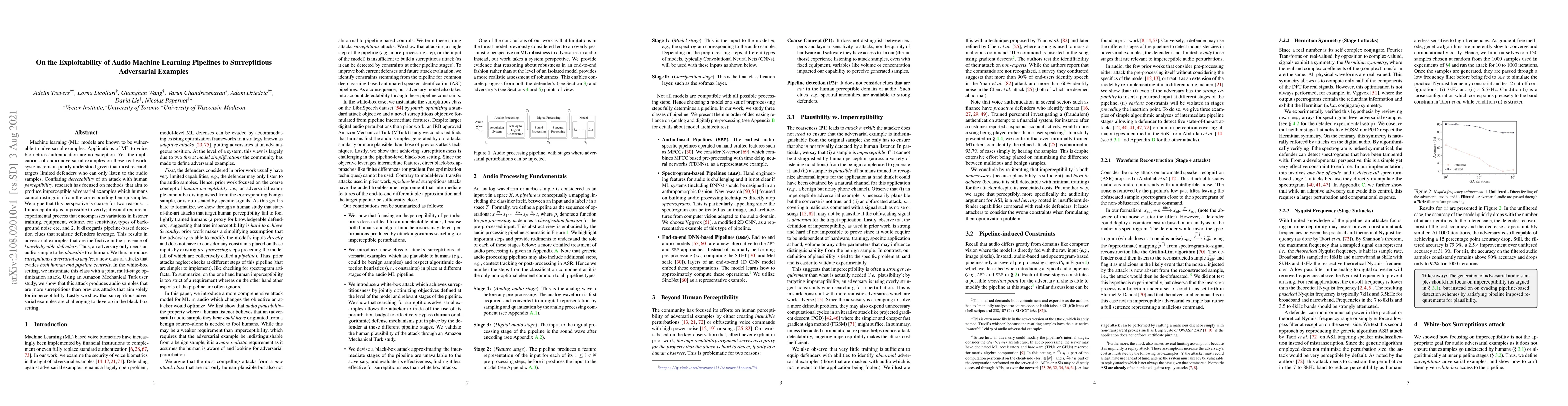 This paper explores the vulnerabilities of audio machine learning pipelines to adversarial examples, arguing that previous research focusing on imperceptible attacks is insufficient. It introduces surreptitious adversarial examples that evade both human and pipeline detection, and demonstrates a more effective attack through a white-box optimization method, while noting the difficulty in developing such attacks in a black-box setting.