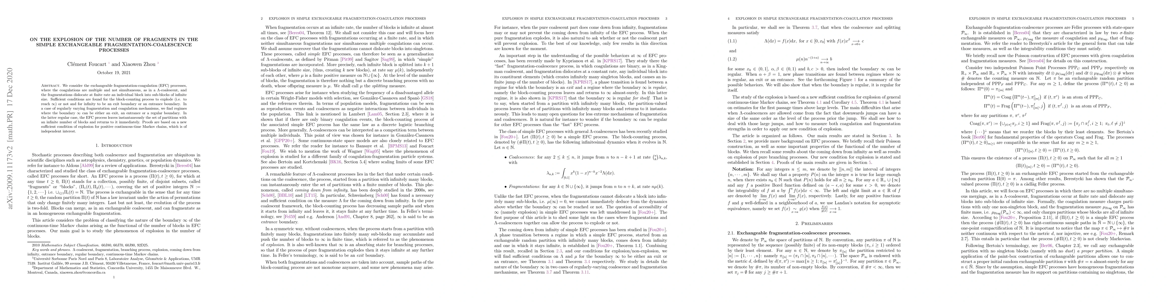 This paper explores exchangeable fragmentation-coalescence processes, identifying conditions under which the block-counting process explodes or remains finite. It finds regimes where the boundary of infinity can act as an exit, entrance, or regular boundary, and introduces a new sufficient condition for explosion in positive continuous-time Markov chains.