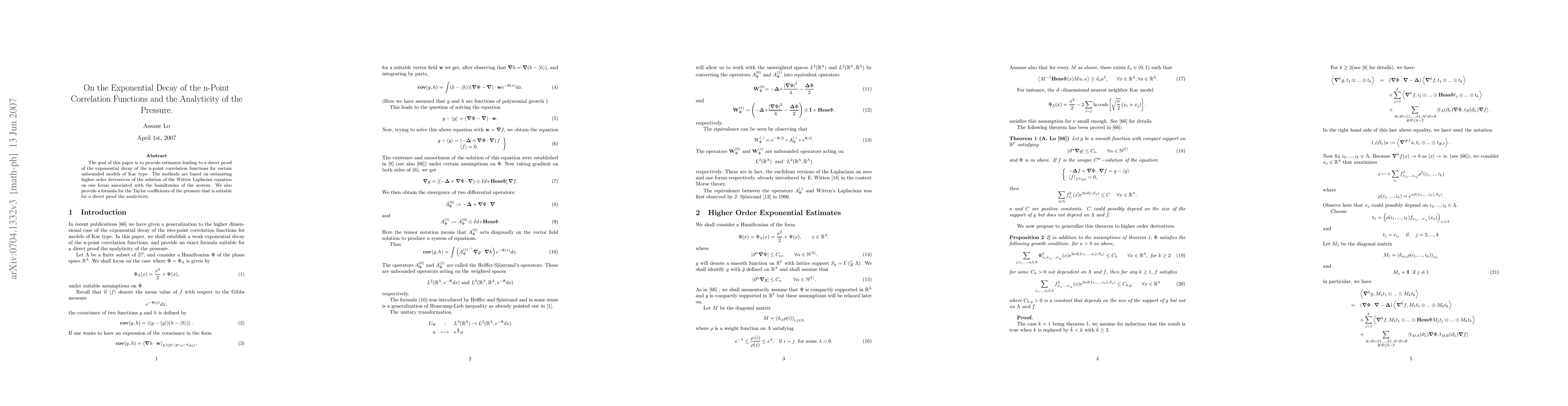 The goal of this paper is to provide estimates leading to a direct proof of the exponential decay of the n-point correlation functions for certain unbounded models of Kac type. The methods are based on estimating higher order derivatives of the solution of the Witten Laplacian equation on one forms associated with the hamiltonian of the system. We also provide a formula for the Taylor coefficients of the pressure that is suitable for a direct proof the analyticity.