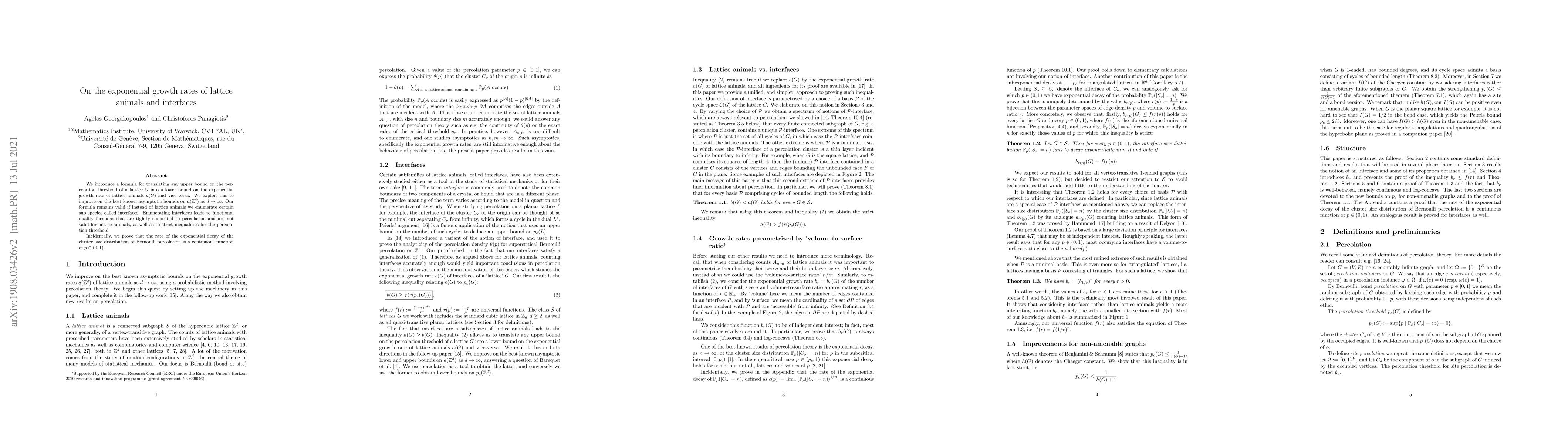 We introduce a formula for translating any upper bound on the percolation threshold of a lattice \g into a lower bound on the exponential growth rate of lattice animals $a(G)$ and vice-versa. We exploit this to improve on the best known asymptotic bounds on $a(\mathbb{Z}^d)$ as $d\to \infty$. Our formula remains valid if instead of lattice animals we enumerate certain sub-species called interfaces. Enumerating interfaces leads to functional duality formulas that are tightly connected to percolation and are not valid for lattice animals, as well as to strict inequalities for the percolation threshold. Incidentally, we prove that the rate of the exponential decay of the cluster size distribution of Bernoulli percolation is a continuous function of $p\in (0,1)$.