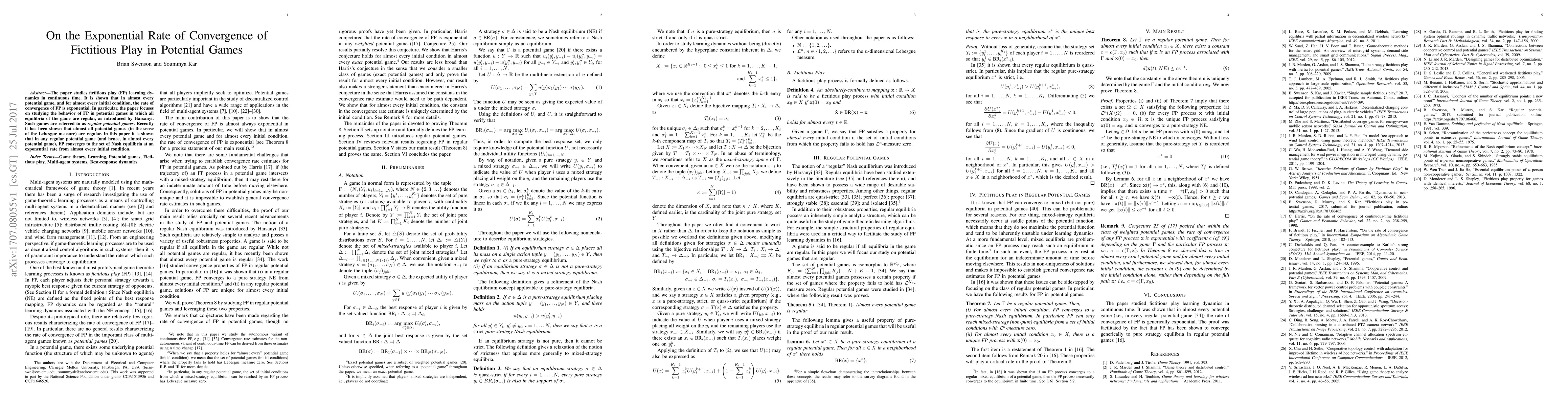 In almost every potential game, fictitious play (FP) learning converges to Nash equilibria at an exponential rate from almost every initial condition.