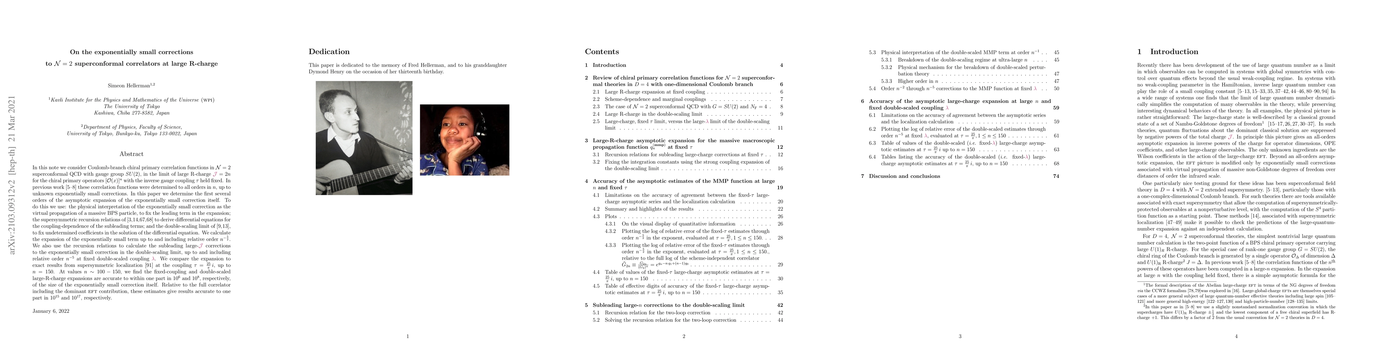 In this note we consider Coulomb-branch chiral primary correlation functions in ${\cal N} = 2$ superconformal QCD with gauge group $SU(2)$, in the limit of large R-charge ${\cal J} = 2n$ for the chiral primary operators $[{\cal O}(x)]^ n$ with the inverse gauge coupling $\tau$ held fixed. In previous work, these correlation functions were determined to all orders in $n$, up to unknown exponentially small corrections. In this paper we determine the first several orders of the asymptotic expansion of the exponentially small correction itself. To do this we use: the physical interpretation of the exponentially small correction as the virtual propagation of a massive BPS particle, to fix the leading term in the expansion; the supersymmetric recursion relations to derive differential equations for the coupling-dependence of the subleading terms; and the double-scaling limit, to fix undetermined coefficients in the solution of the differential equation. We calculate the expansion of the exponentially small term up to and including relative order $n^{-{5\over 2}}$. We also use the recursion relations to calculate the subleading large-${\cal J}$ corrections to the exponentially small correction in the double-scaling limit, up to and including relative order $n^{-5}$ at fixed double-scaled coupling $\lambda$. We compare the expansion to exact results from supersymmetric localization at the coupling $\tau = {{25}\over \pi} i$, up to $n=150$. At values $n\sim 100-150$, we find the fixed-coupling and double-scaled large-R-charge expansions are accurate to within one part in $10^ 6$ and $10^ 8$, respectively, of the size of the exponentially small correction itself. Relative to the full correlator including the dominant EFT contribution, these estimates give results accuracte to one part in $10^{15}$ and $10^{17}$, respectively.