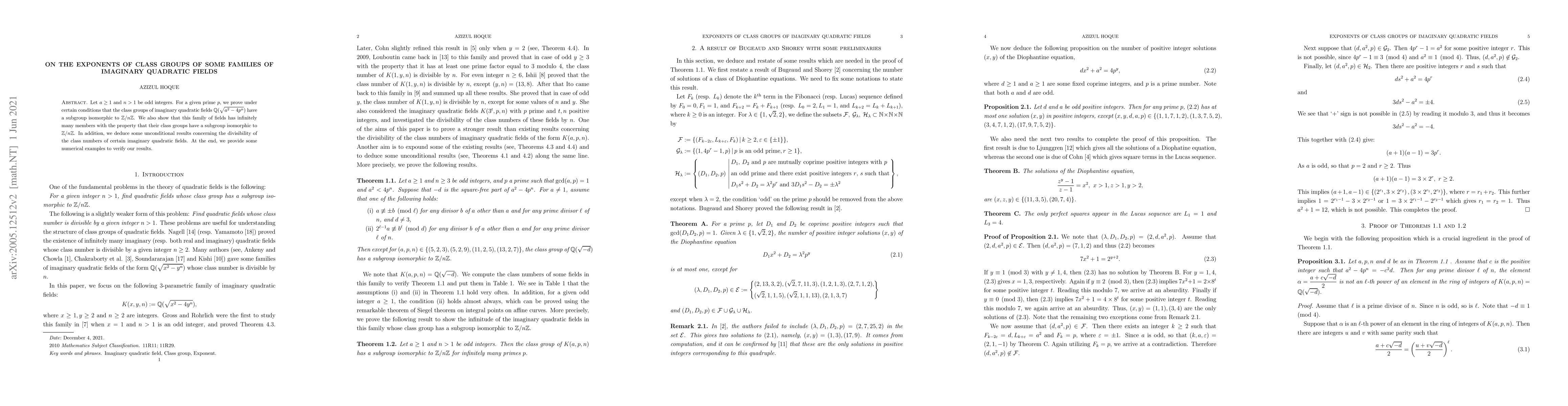 Let $a\geq 1$ and $n>1$ be odd integers. For a given prime $p$, we prove under certain conditions that the class groups of imaginary quadratic fields $\mathbb{Q}(\sqrt{a^2-4p^n})$ have a subgroup isomorphic to $\mathbb{Z}/n\mathbb{Z}$. We also show that this family of fields has infinitely many members with the property that their class groups have a subgroup isomorphic to $\mathbb{Z}/n\mathbb{Z}$. In addition, we deduce some unconditional results concerning the divisibility of the class numbers of certain imaginary quadratic fields. At the end, we provide some numerical examples to verify our results.