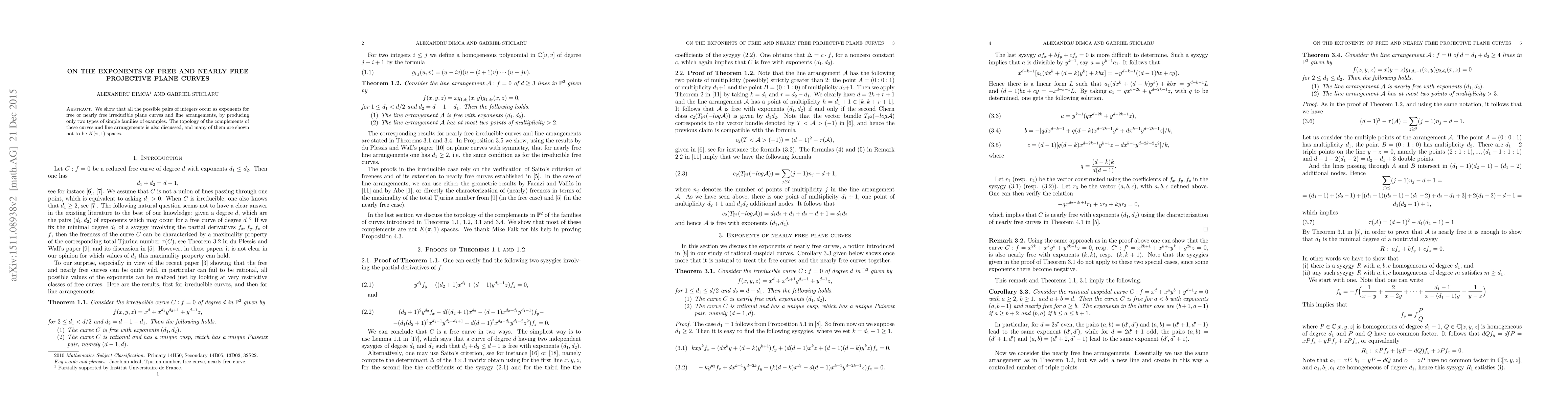 This paper demonstrates that any integer pair can serve as exponents for free or nearly free irreducible plane curves and line arrangements, presenting just two simple families of examples. It also examines the topology of the complements of these curves, revealing that many are not $K(\pi,1)$ spaces.
