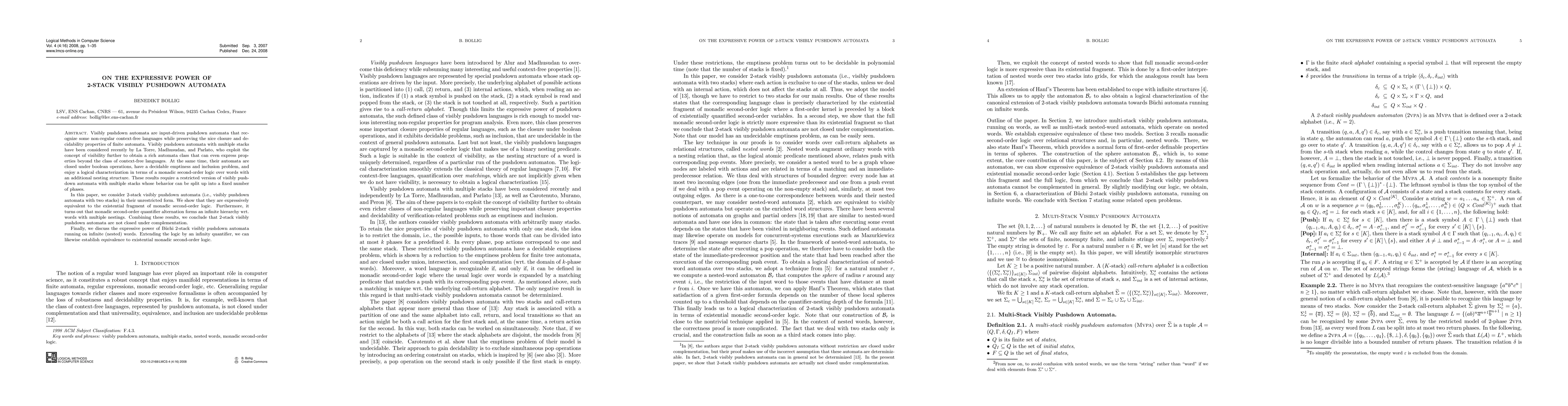 Visibly pushdown automata are input-driven pushdown automata that recognize some non-regular context-free languages while preserving the nice closure and decidability properties of finite automata. Visibly pushdown automata with multiple stacks have been considered recently by La Torre, Madhusudan, and Parlato, who exploit the concept of visibility further to obtain a rich automata class that can even express properties beyond the class of context-free languages. At the same time, their automata are closed under boolean operations, have a decidable emptiness and inclusion problem, and enjoy a logical characterization in terms of a monadic second-order logic over words with an additional nesting structure. These results require a restricted version of visibly pushdown automata with multiple stacks whose behavior can be split up into a fixed number of phases. In this paper, we consider 2-stack visibly pushdown automata (i.e., visibly pushdown automata with two stacks) in their unrestricted form. We show that they are expressively equivalent to the existential fragment of monadic second-order logic. Furthermore, it turns out that monadic second-order quantifier alternation forms an infinite hierarchy wrt words with multiple nestings. Combining these results, we conclude that 2-stack visibly pushdown automata are not closed under complementation. Finally, we discuss the expressive power of B\"{u}chi 2-stack visibly pushdown automata running on infinite (nested) words. Extending the logic by an infinity quantifier, we can likewise establish equivalence to existential monadic second-order logic.