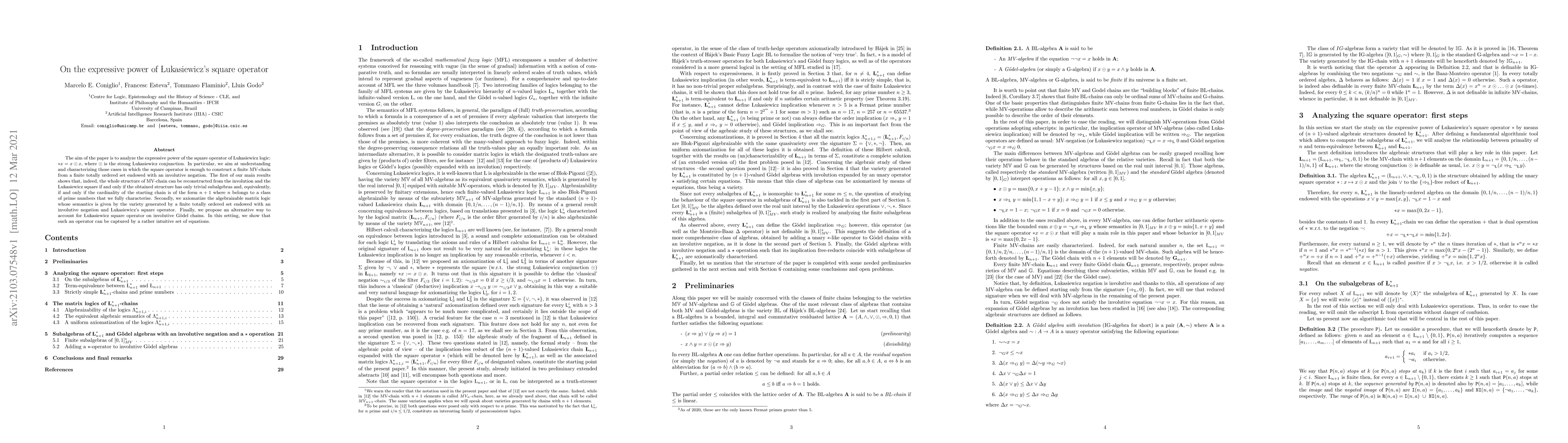 The aim of the paper is to analyze the expressive power of the square operator of Lukasiewicz logic: $\ast x=x\odot x$, where $\odot$ is the strong Lukasiewicz conjunction. In particular, we aim at understanding and characterizing those cases in which the square operator is enough to construct a finite MV-chain from a finite totally ordered set endowed with an involutive negation. The first of our main results shows that, indeed, the whole structure of MV-chain can be reconstructed from the involution and the Lukasiewicz square if and only if the obtained structure has only trivial subalgebras and, equivalently, if and only if the cardinality of the starting chain is of the form $n+1$ where $n$ belongs to a class of prime numbers that we fully characterize. Secondly, we axiomatize the algebraizable matrix logic whose semantics is given by the variety generated by a finite totally ordered set endowed with an involutive negation and Lukasiewicz's square operator. Finally, we propose an alternative way to account for Lukasiewicz square operator on involutive G\"odel chains. In this setting, we show that such an operator can be captured by a rather intuitive set of equations.