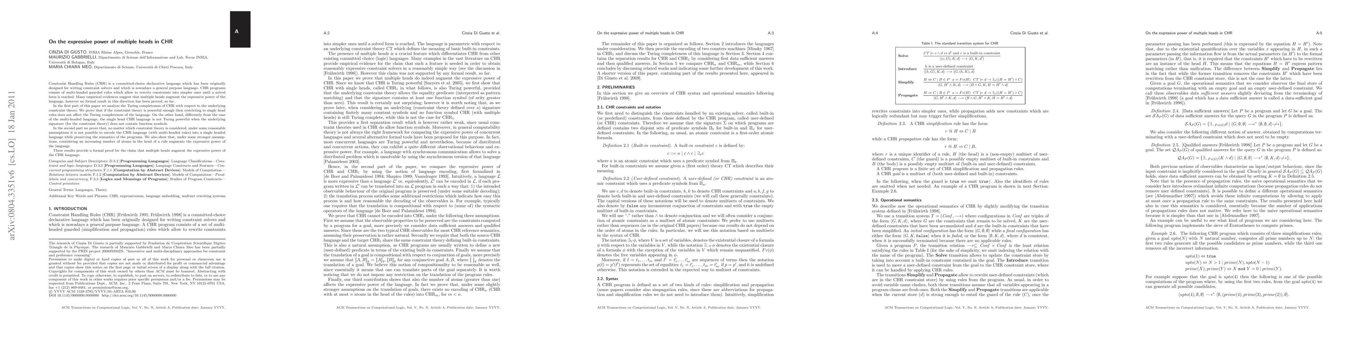 A research paper proves that multiple heads in Constraint Handling Rules (CHR) language augment its expressive power, while restricting to single head rules does not affect Turing completeness with powerful constraint theories.