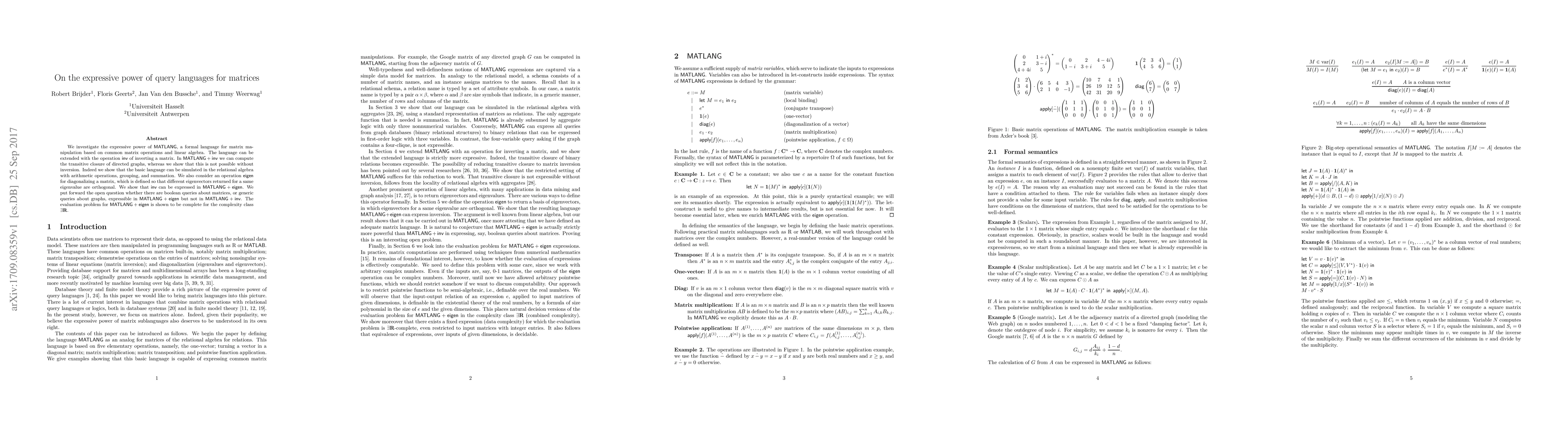 This paper explores the expressive power of $\mathsf{MATLANG}$, a matrix manipulation language, and its extensions with matrix inversion and eigendecomposition. It demonstrates that inversion enables the computation of transitive closures, while eigendecomposition allows inversion to be expressed within the language. The study raises an open question regarding the expressiveness of $\mathsf{MATLANG}$ with eigendecomposition alone versus with inversion.